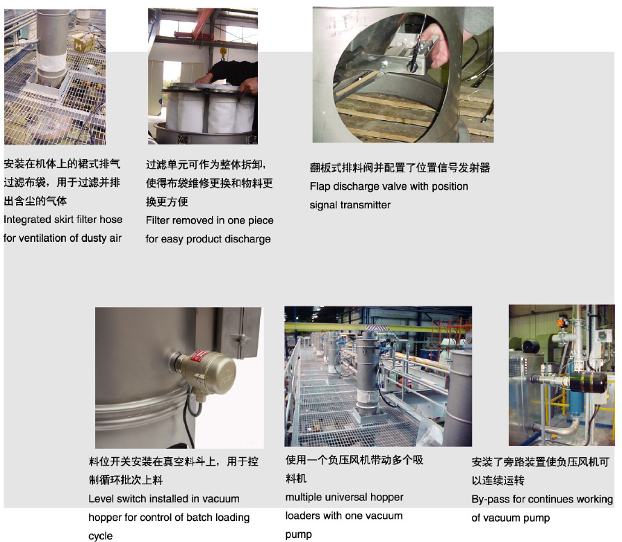 采用德国技术,专为粉料或粉粒中混合粒料而设计,用于粉料的上料装置,采用负压气力输送系统,包括脉冲压缩空气反吹布袋过滤器和翻板阀放料装置。具有使用稳定,性能可靠、免维护的性。