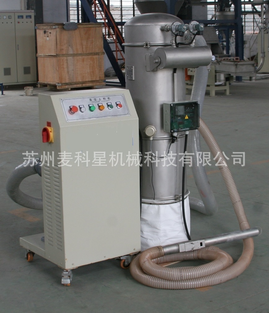 又被称之为:真空吸料机、真空喂料机、负压吸料机、真空上料系统等。用于挤出机或其他塑料加工机械的供料,或者给料斗、料仓等储存设备供料。用于将粉状、粒状、片状或含有粉尘的粒状片状物料向加工机械或料斗自动供料。也可以用在负压输送系统中作为物料分离设备使用。可单独使用,有自己独立的控制系统和一台真空泵;也可以用在中央供料系统中,使用一台大型真空泵驱动几台或者几十台系统式真空上料机,并由一个控制系统控制,在规模化的生产中,多采用此方式,具有使用成本低、节能、节省人力等优点。