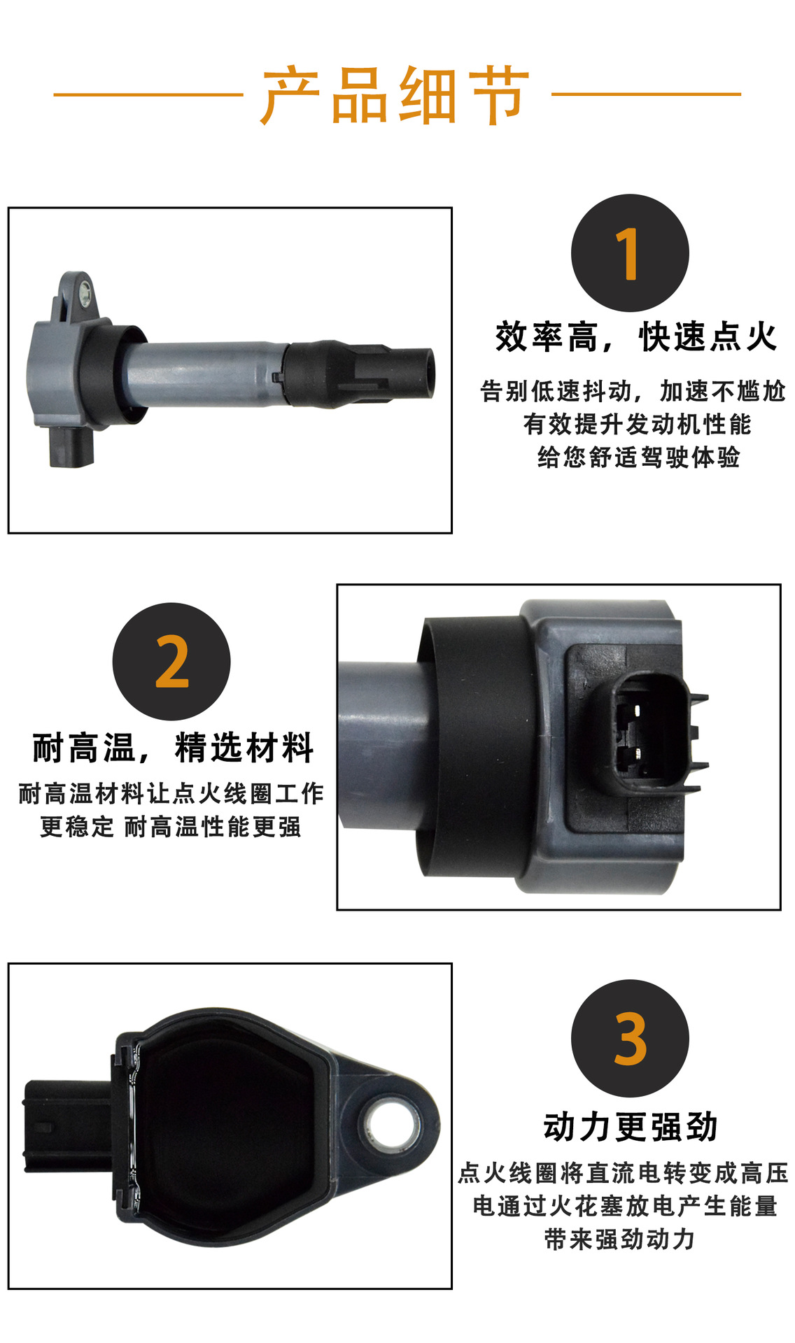 耐用材料:使用高质量绝缘材料和耐高温组件,增强点火线圈的稳定性和寿命,适应各种恶劣工作环境。