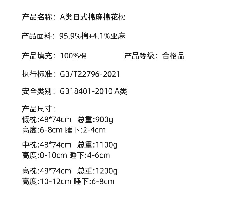 - 颜色:日式棉麻棉花枕-低枕-48*74cm【单只装】