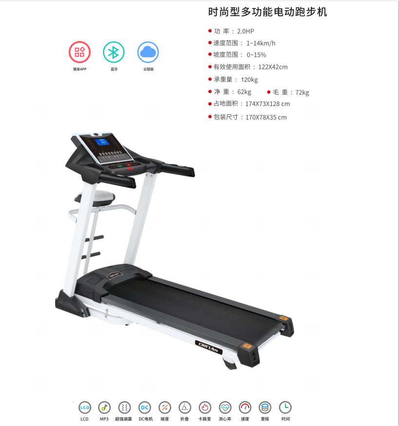 ◆ 采用蓝色背光LCD显示屏,内设24种智能跑步程序。