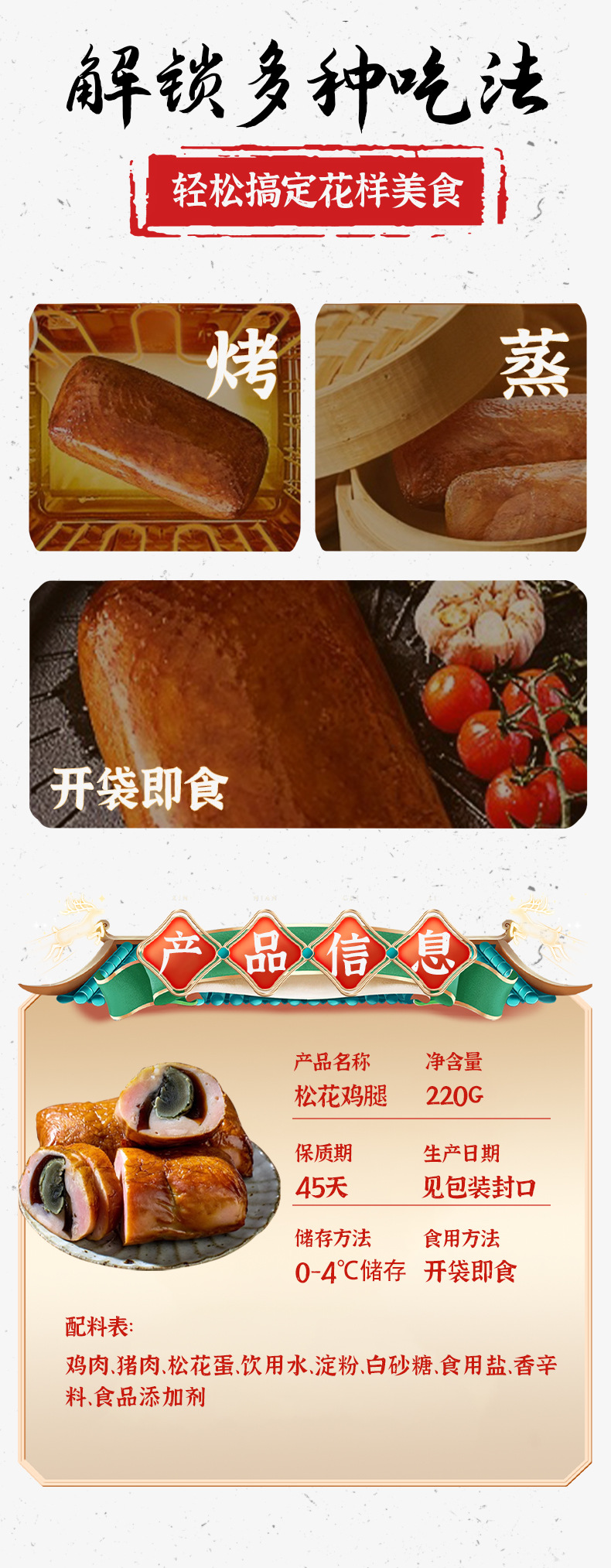 - 包装规格:松花鸡腿肠220g