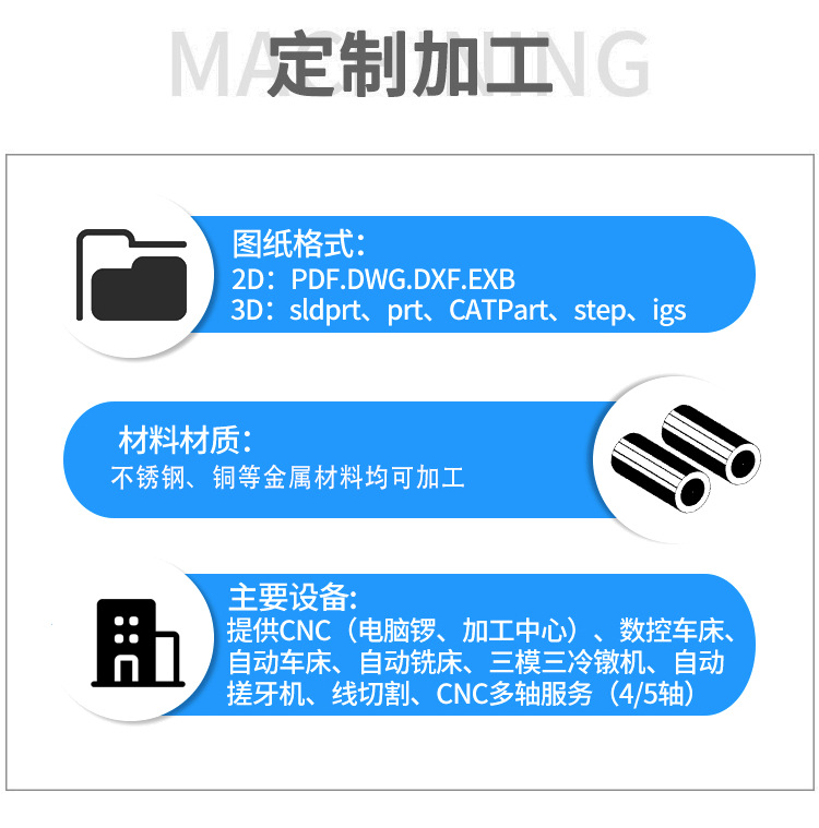- 可加工材料:不锈钢等