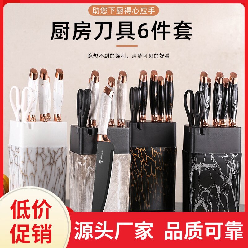 厂家现货厨房家用多功能一体不粘刀具不锈钢带刀座大理石纹七件套