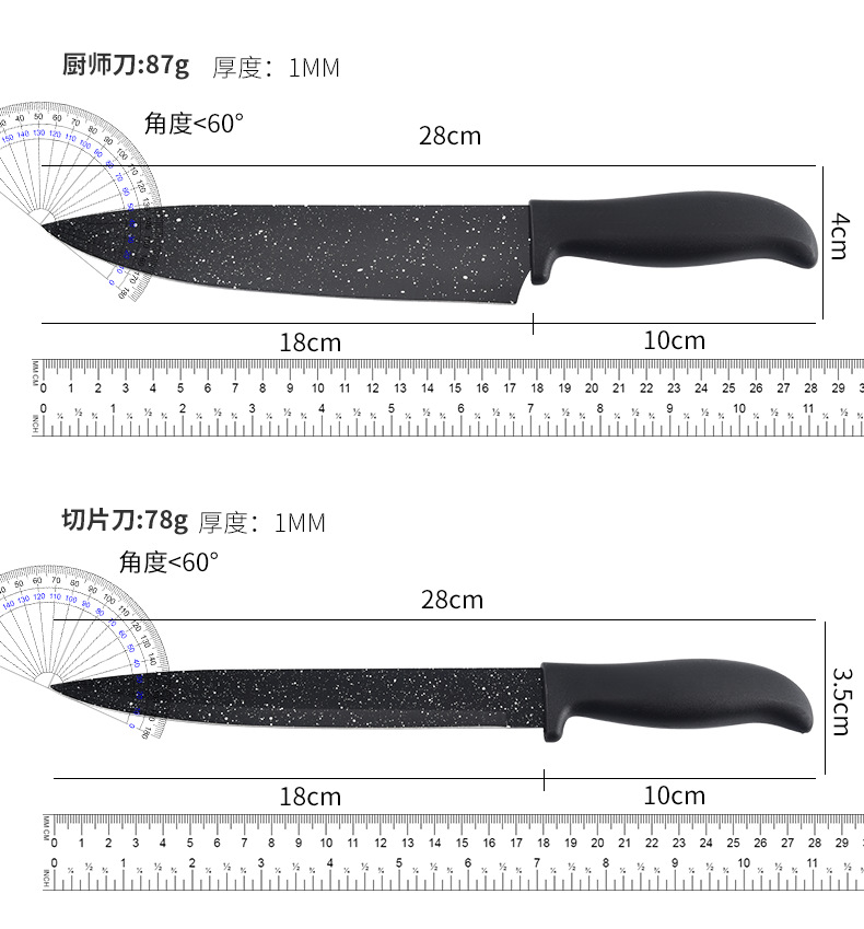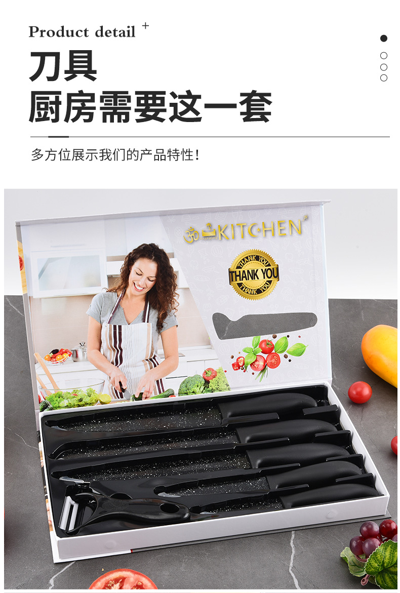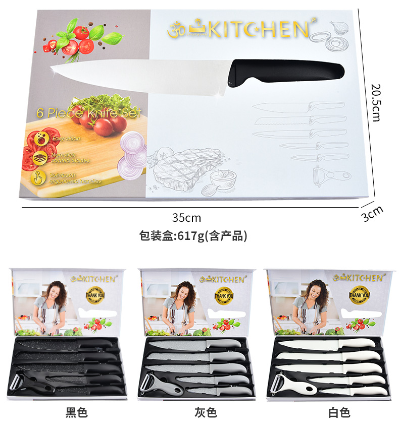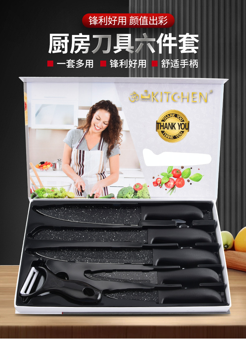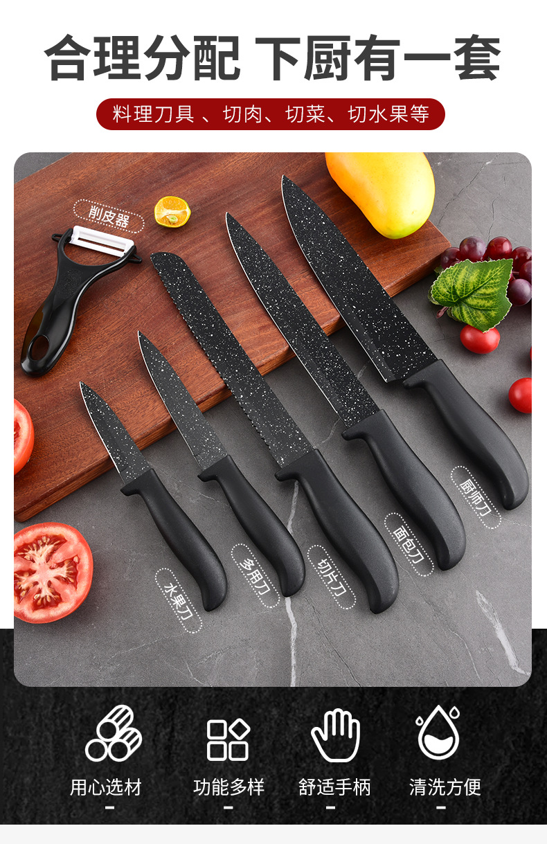 新款现货工厂批发不锈钢喷漆刀元宝柄墨饭石六件套刀跨境热卖刀具