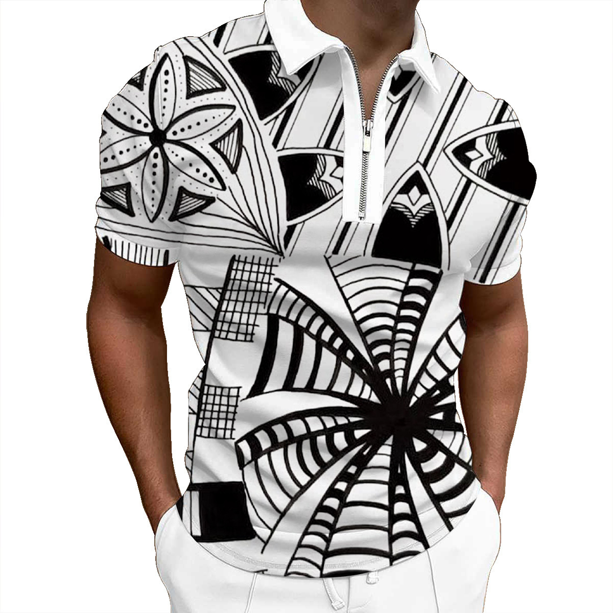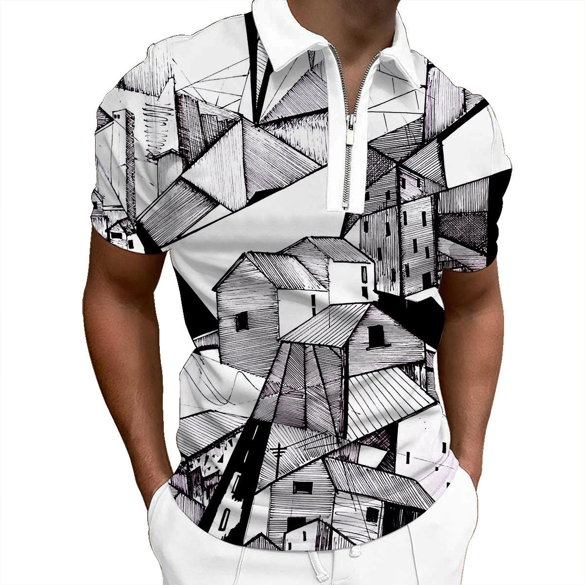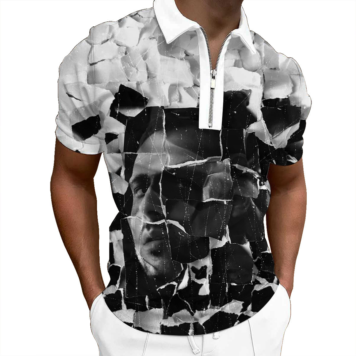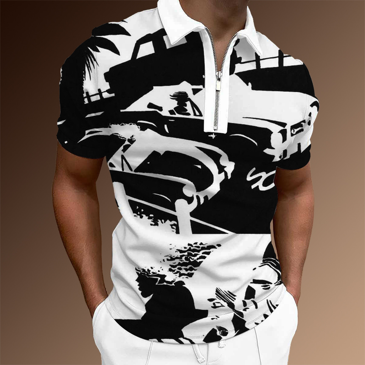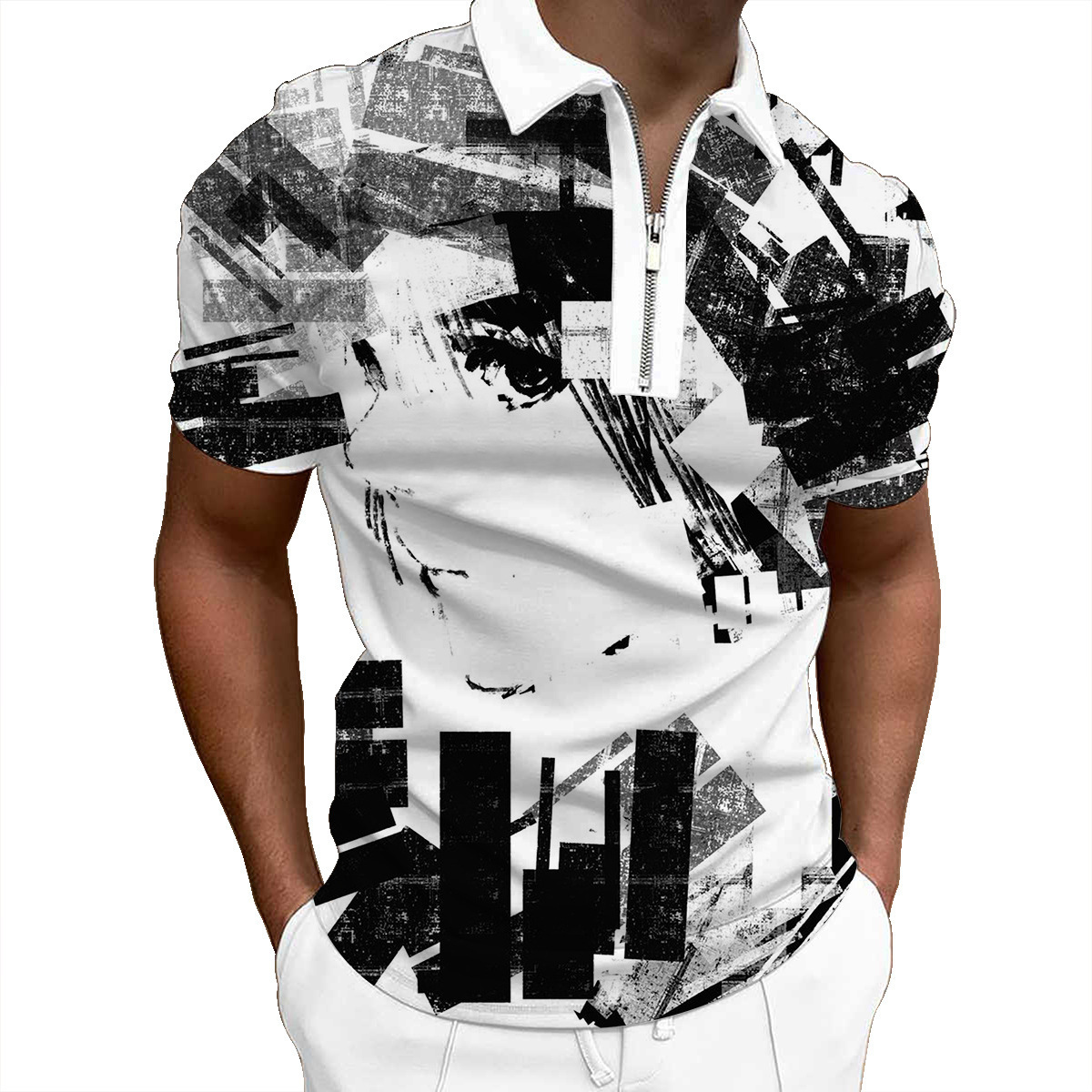 欧美新款男士翻领印花拉链Polo衫短袖休闲款T恤运动装上衣