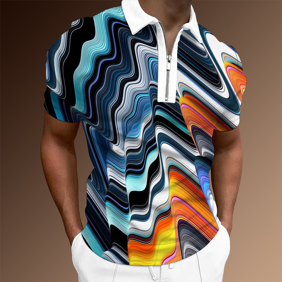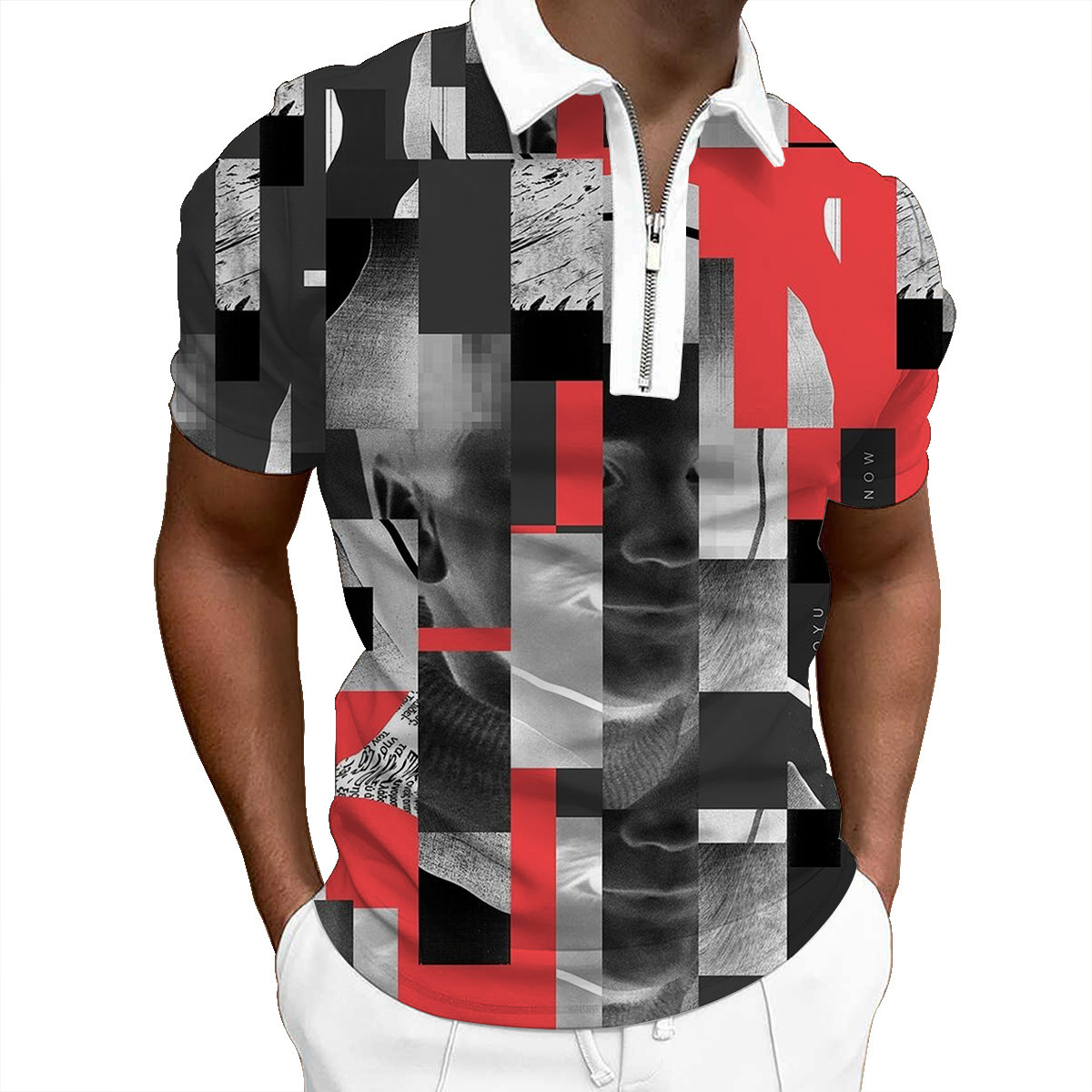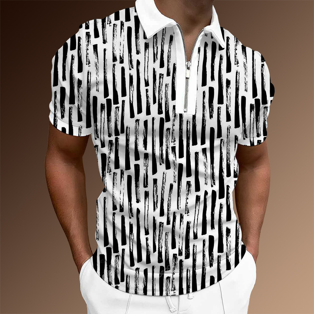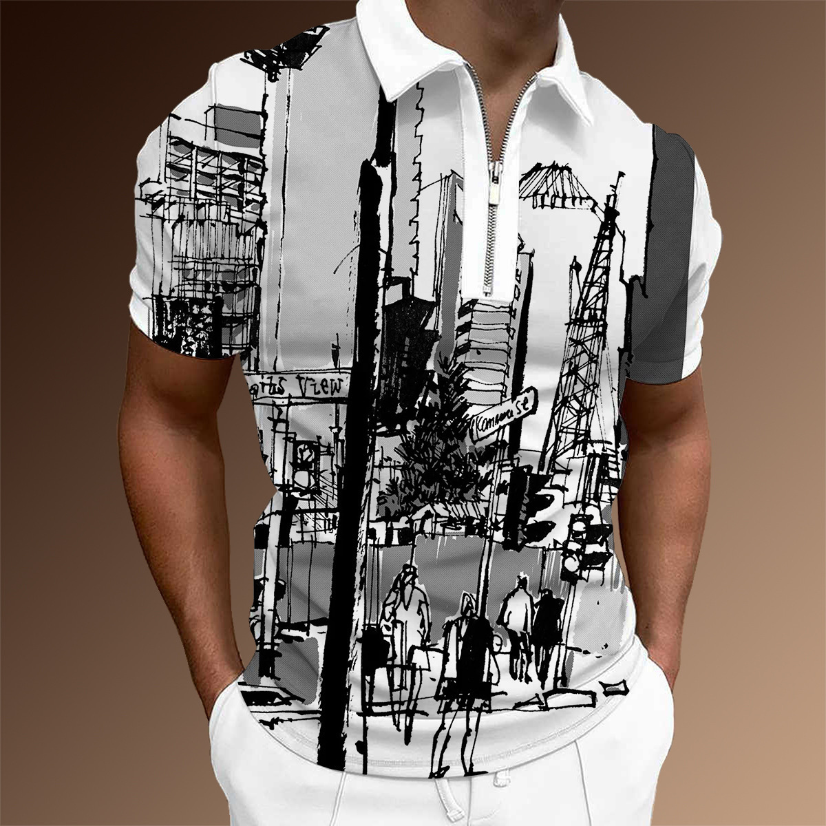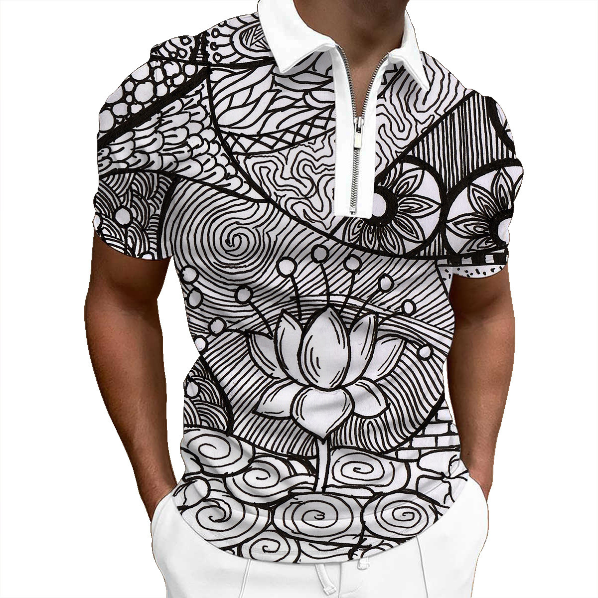 欧美新款男士翻领印花拉链Polo衫短袖休闲款T恤运动装上衣