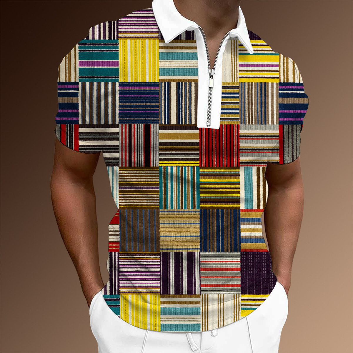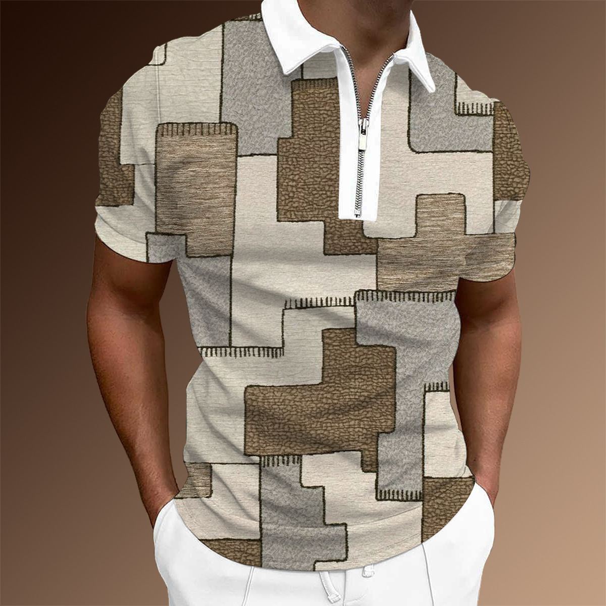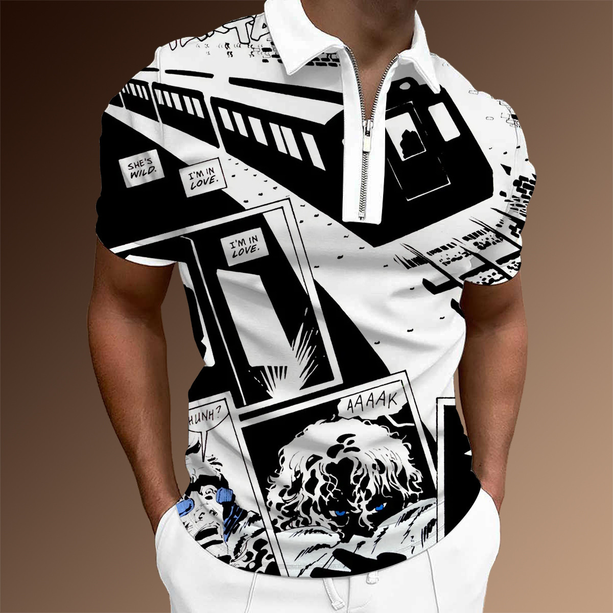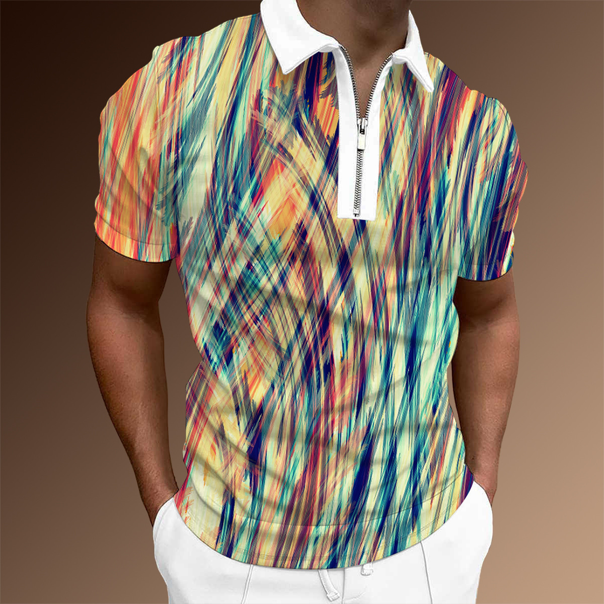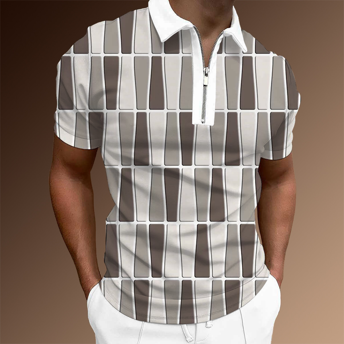 欧美新款男士翻领印花拉链Polo衫短袖休闲款T恤运动装上衣