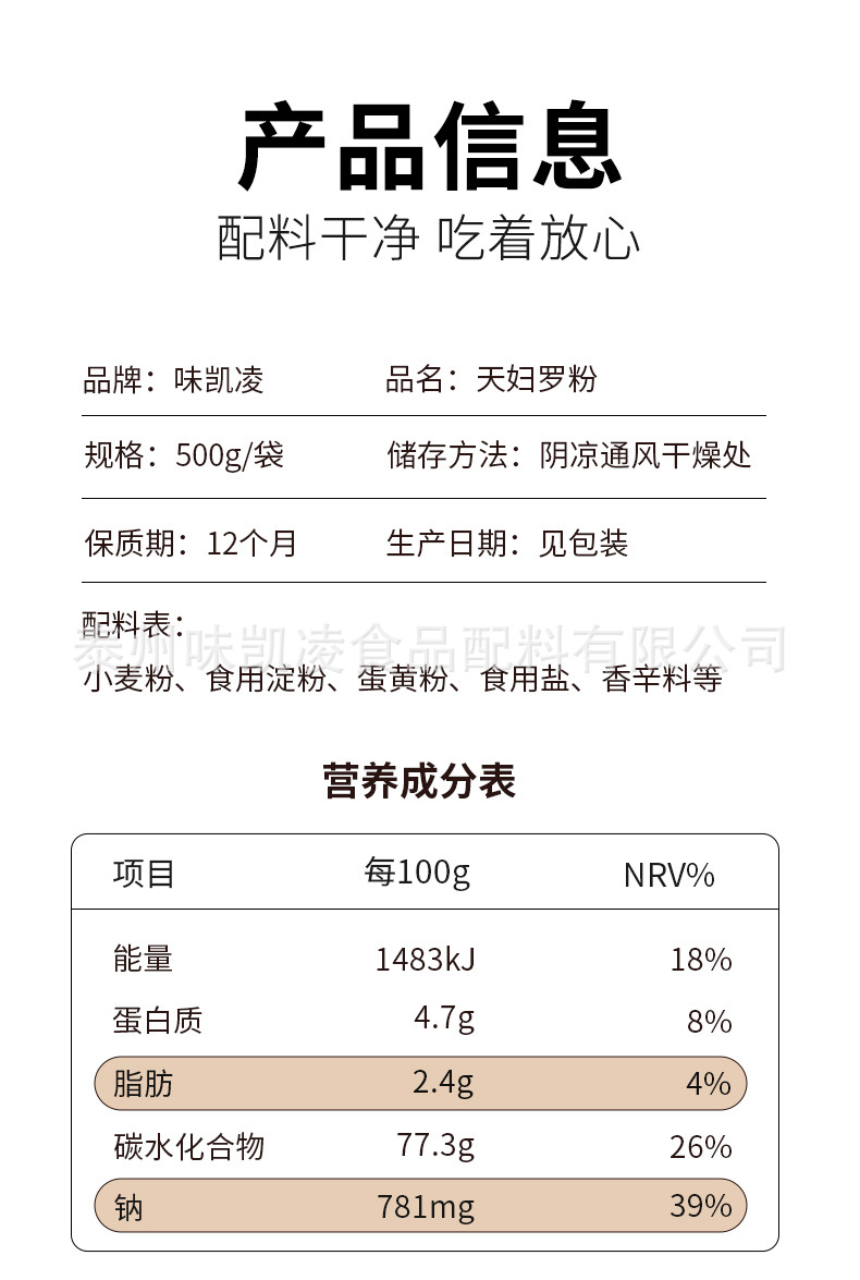 - 原料与配料:小麦粉 食用淀粉 蛋黄粉 食用盐 香辛料