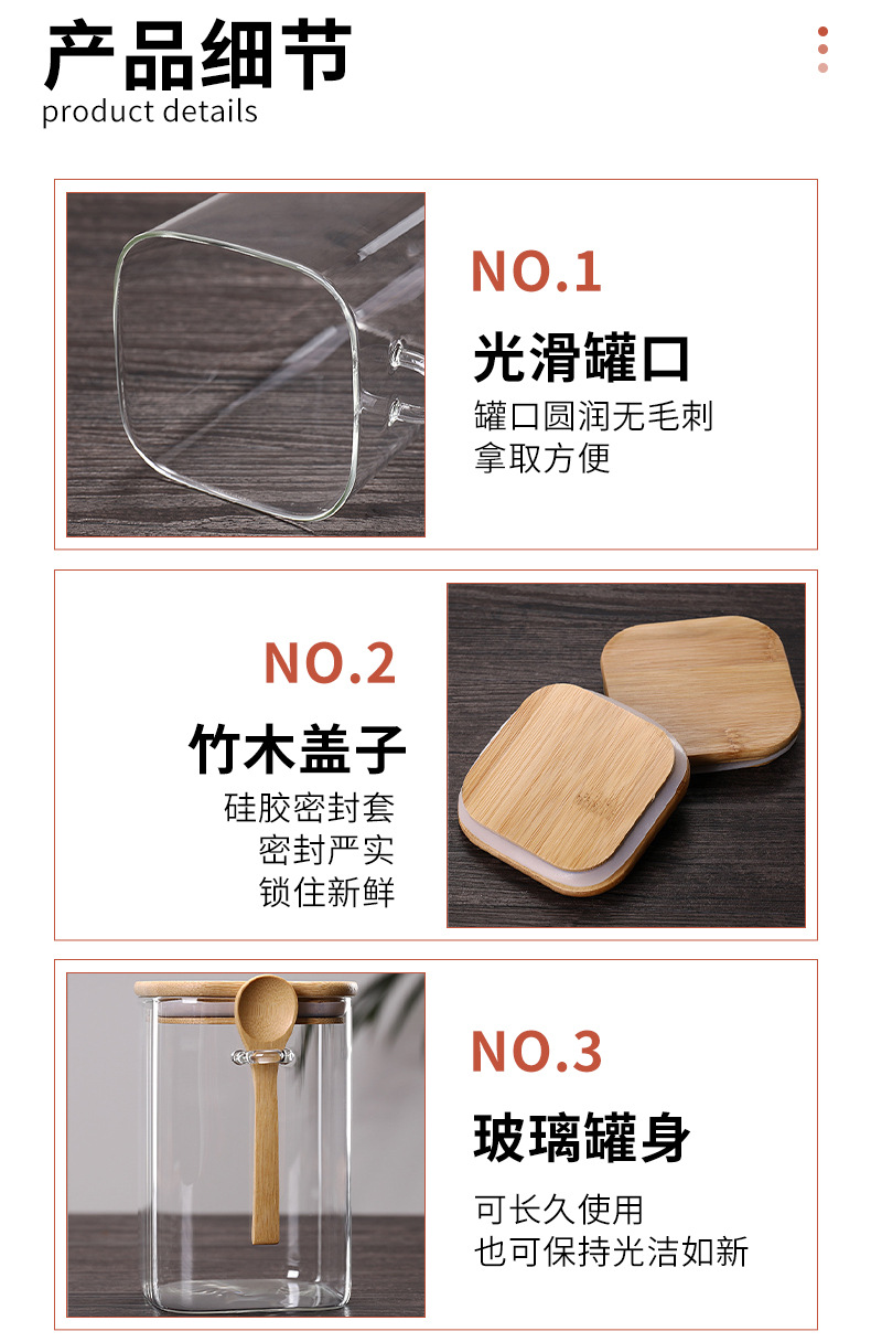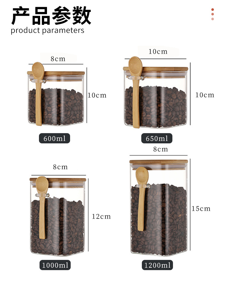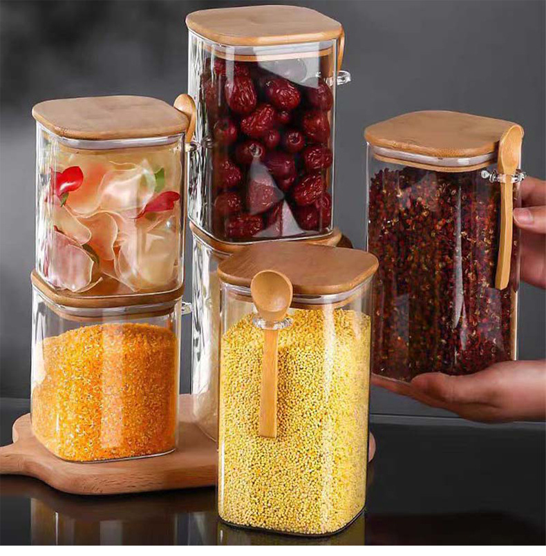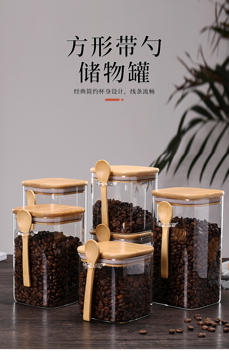 现货方形带勺储物罐厨房用大容量密封罐带竹勺竹盖五谷杂粮收纳罐
