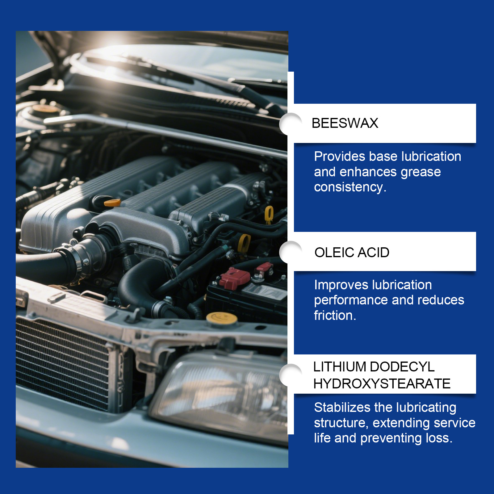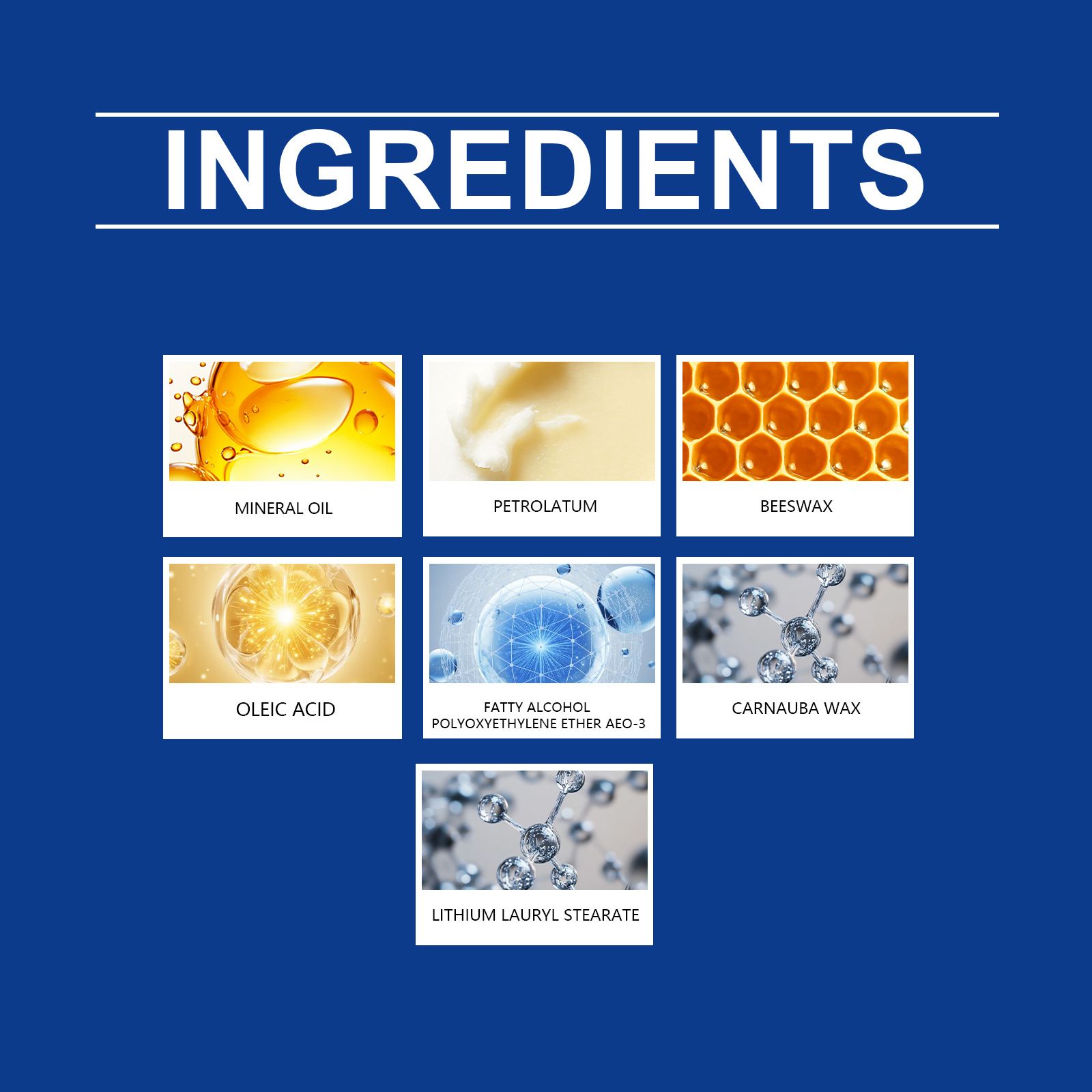 - 主要成分:矿油、矿脂、蜂蜡、油酸、脂肪醇聚氧乙烯醚 AEO -3、巴西棕榈树蜡、十二羟基硬脂酸锂