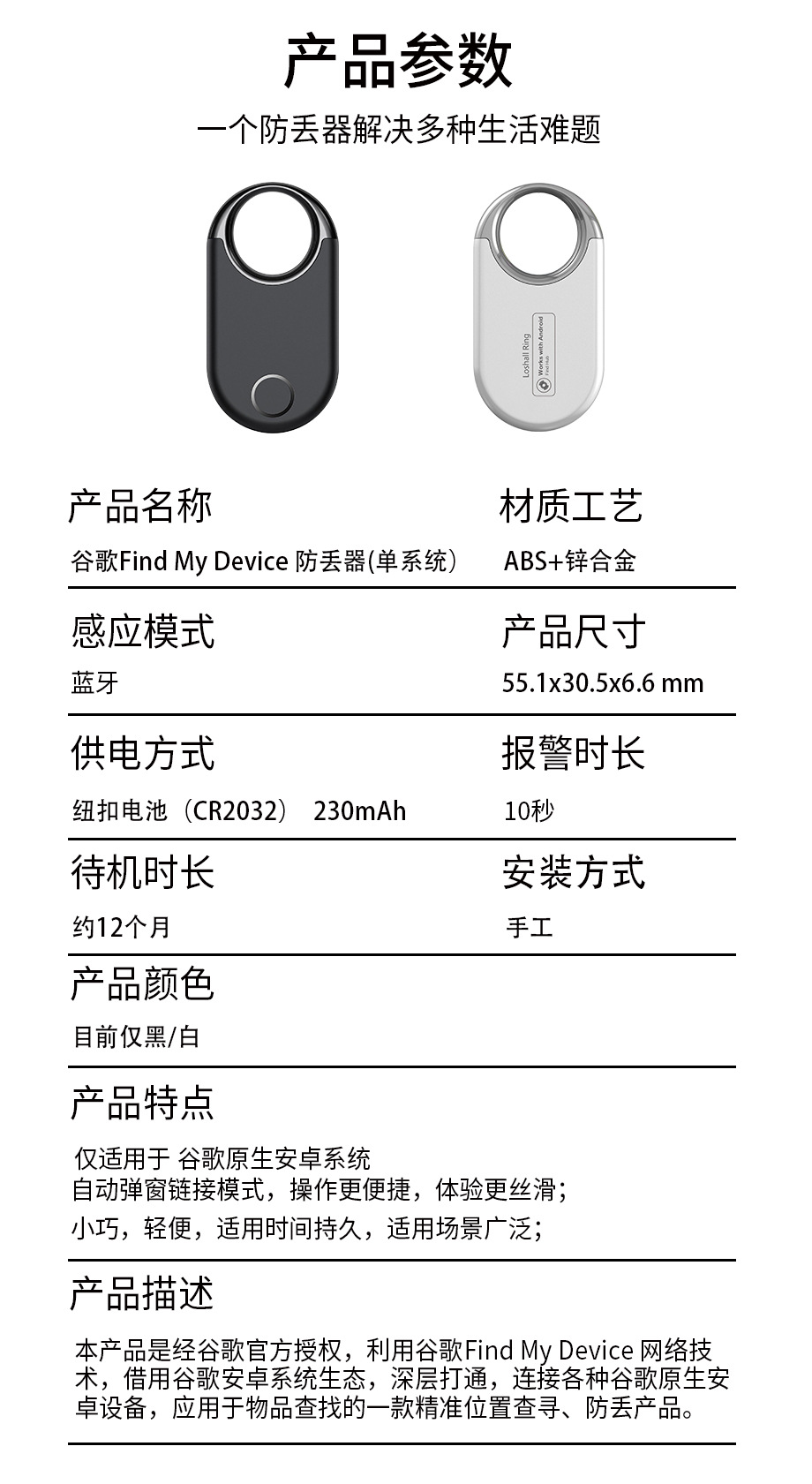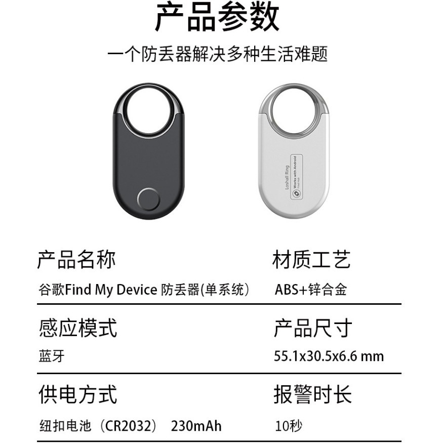 - 包装清单:防丢器+说明书+防震内托+包装盒