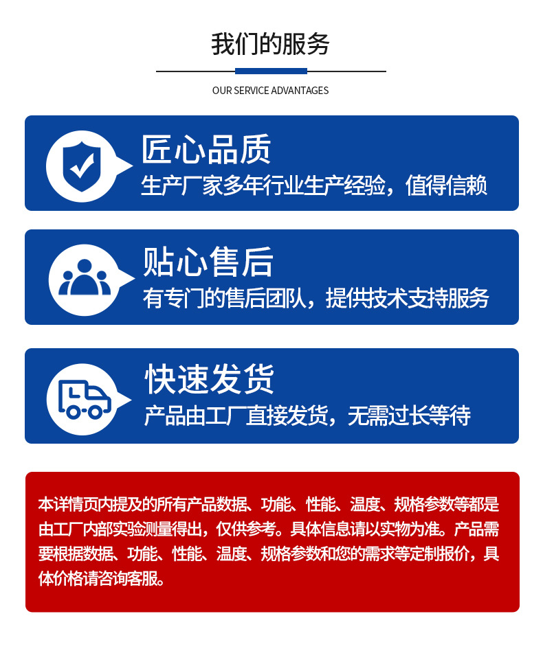 本详情页内提及的所有产品数据、功能、性能、温度、规格参数等 都是由工厂内部实验测量得出,仅供参考。具体信息请以实物为准 。产品需要根据数据、功能、性能、温度、规格参数和您的需求等 定制报价,具体价格请咨询客服。