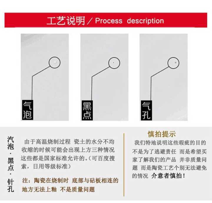【说明】关于产品的质量,陶瓷产品均为半手工或全手工制品,存在一定 的 瑕疵,不可避免的小黑点、小气泡、小凹凸、小针眼,不同批 次产生的杯子也会存在一定的色差,不属于质量问题,请各位客 知,不能接受的和完美主义者请勿拍!