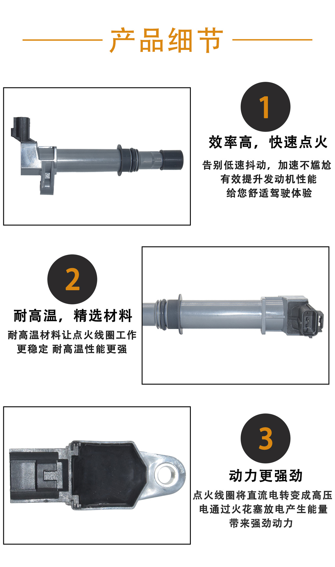 耐用材料:使用高质量绝缘材料和耐高温组件,增强点火线圈的稳定性和寿命,适应各种恶劣工作环境。