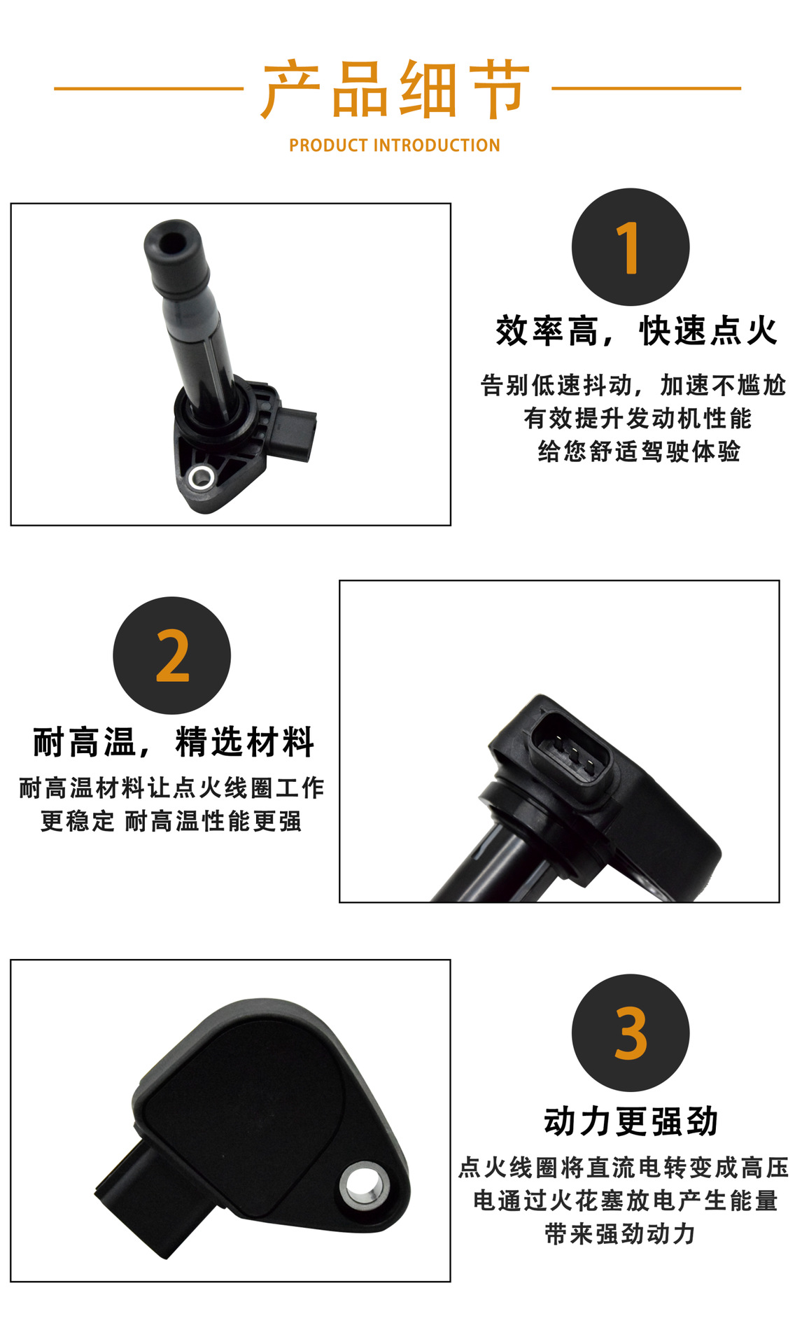 耐用材料:使用高质量绝缘材料和耐高温组件,增强点火线圈的稳定性和寿命,适应各种恶劣工作环境。