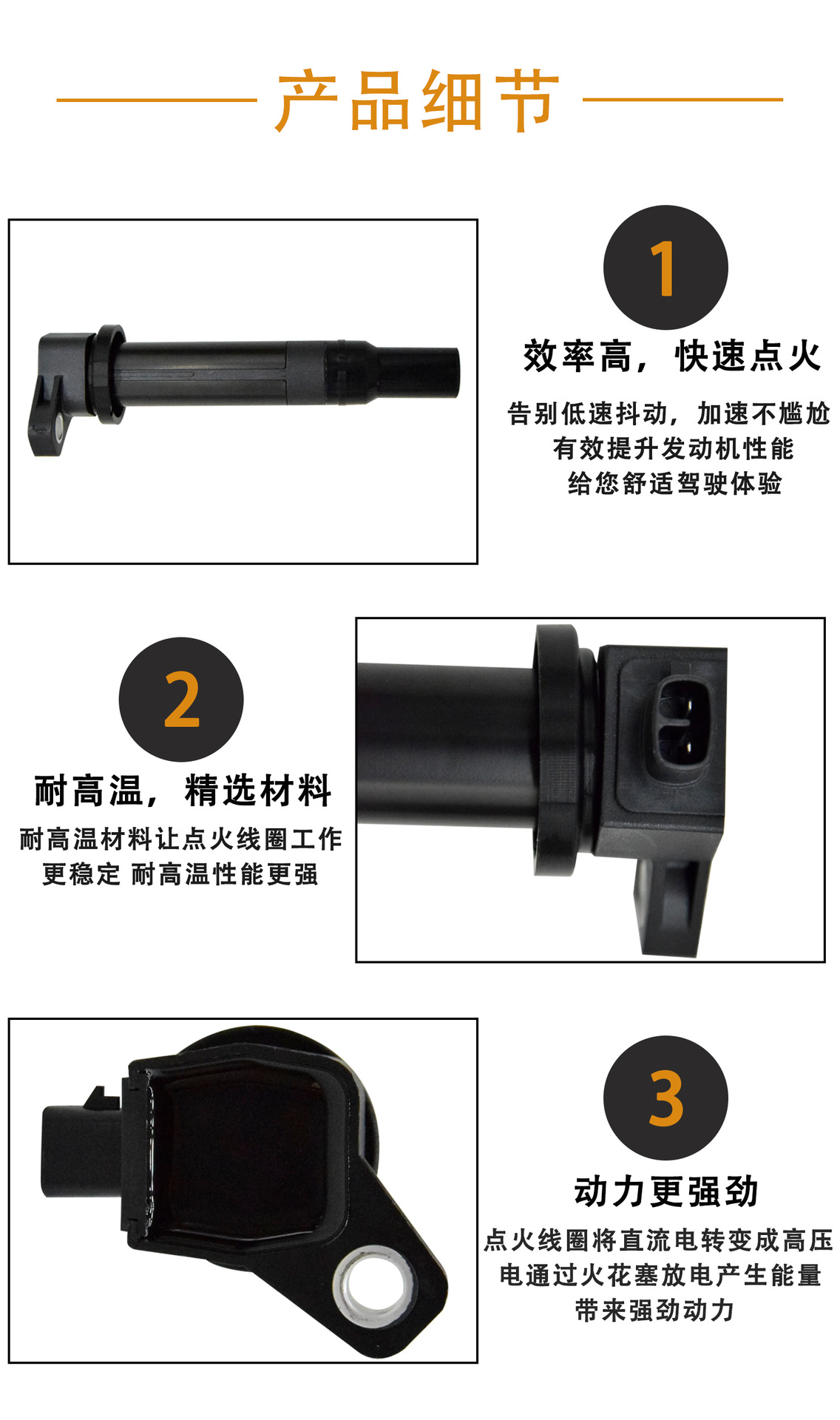 耐用材料:使用高质量绝缘材料和耐高温组件,增强点火线圈的稳定性和寿命,适应各种恶劣工作环境。