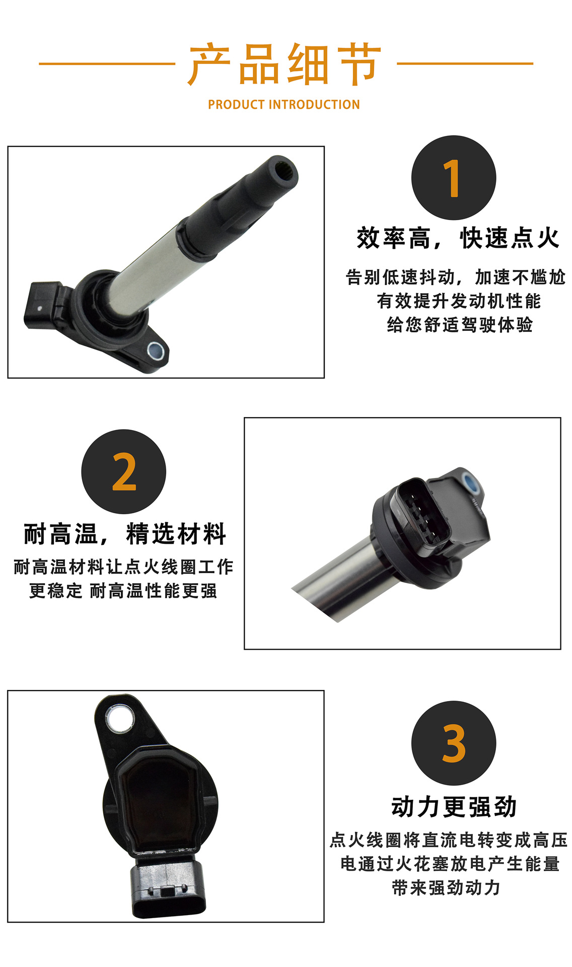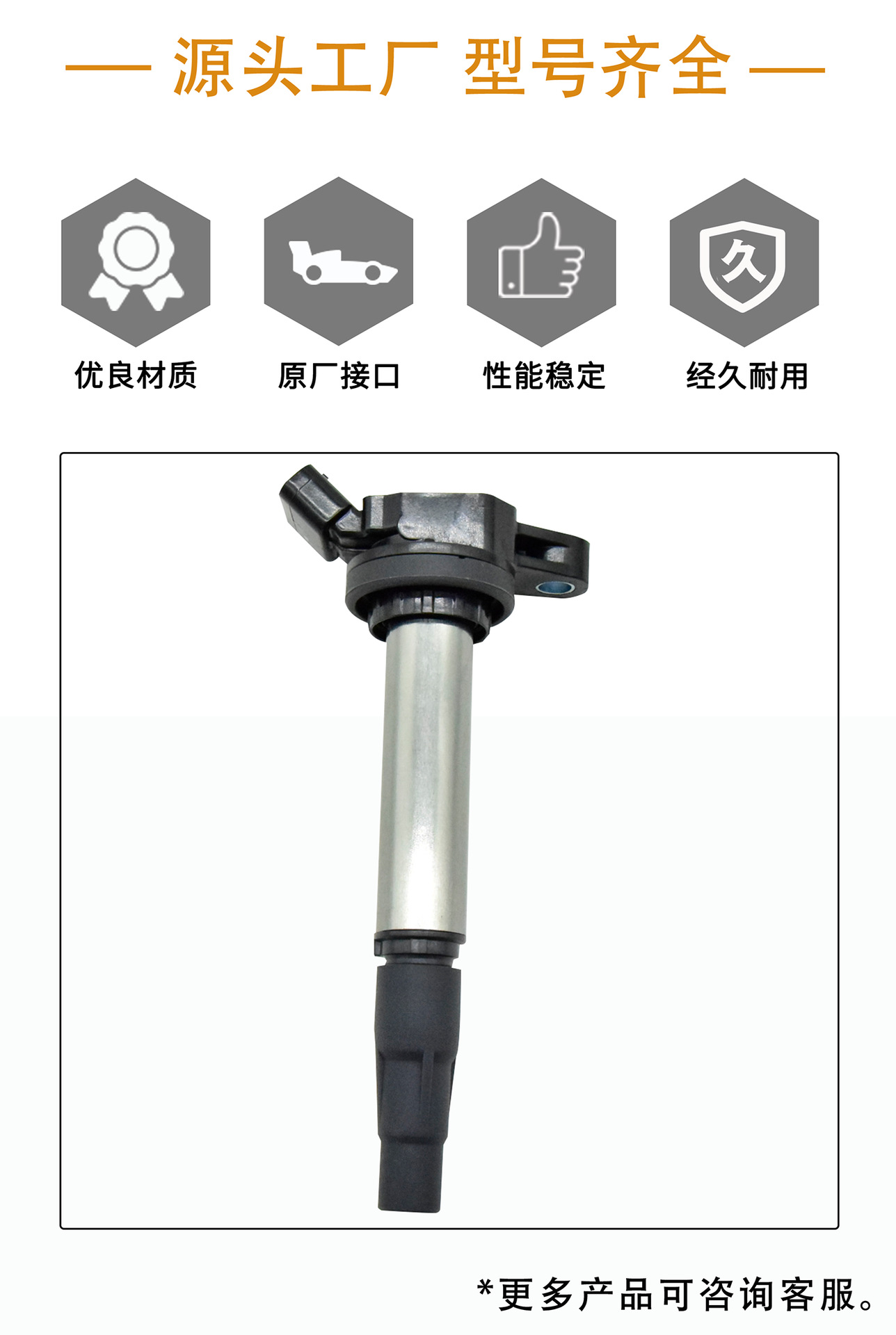 耐用材料:使用高质量绝缘材料和耐高温组件,增强点火线圈的稳定性和寿命,适应各种恶劣工作环境。