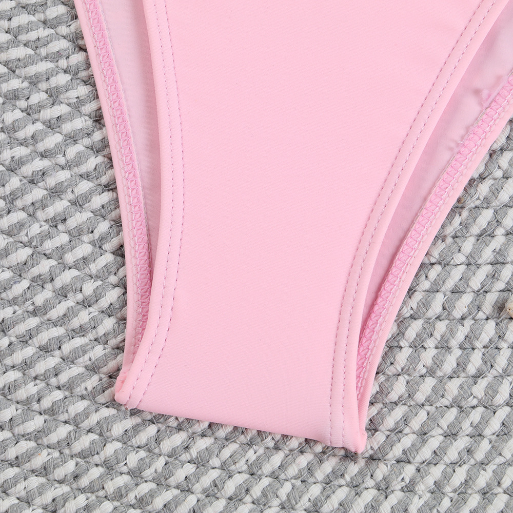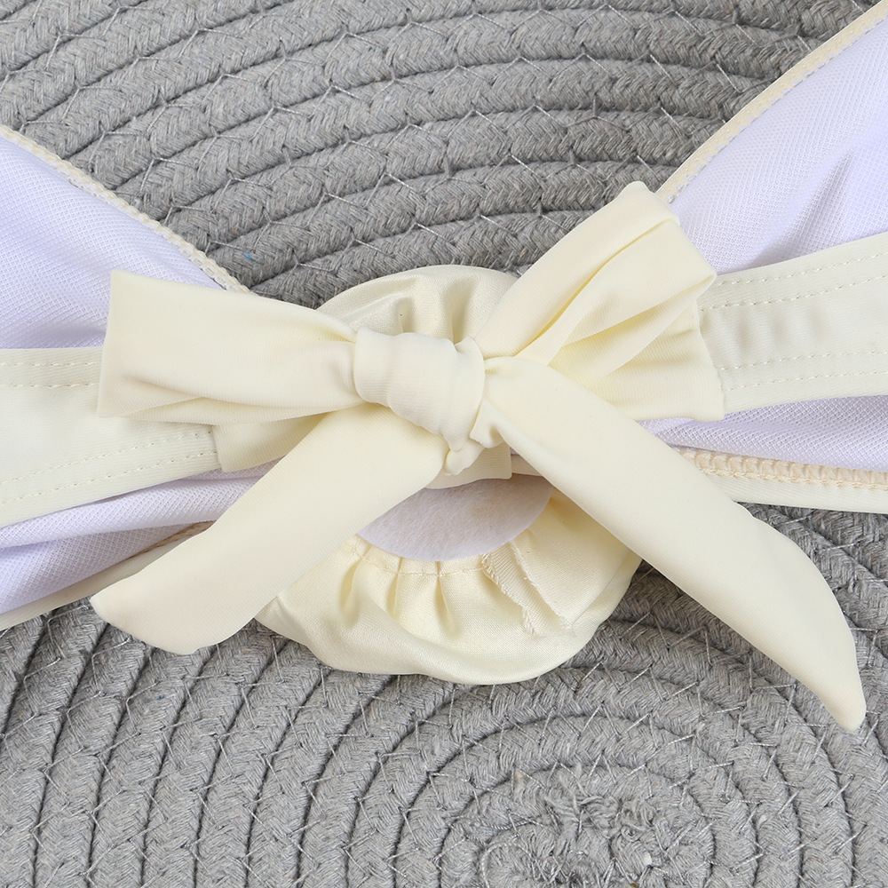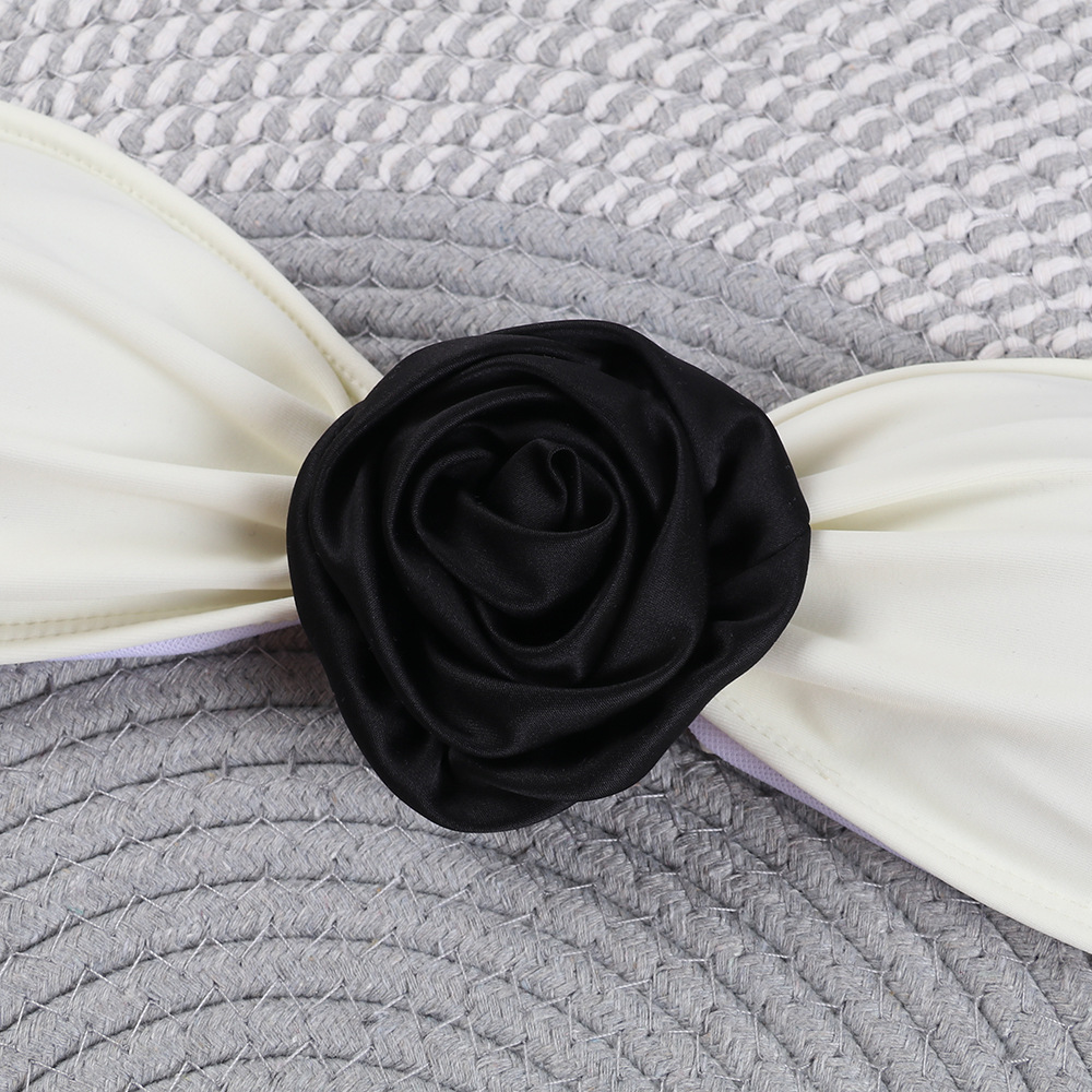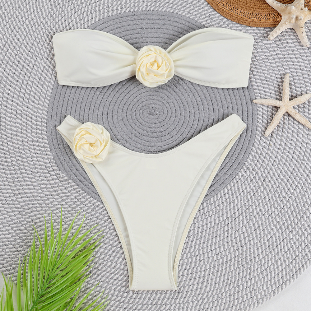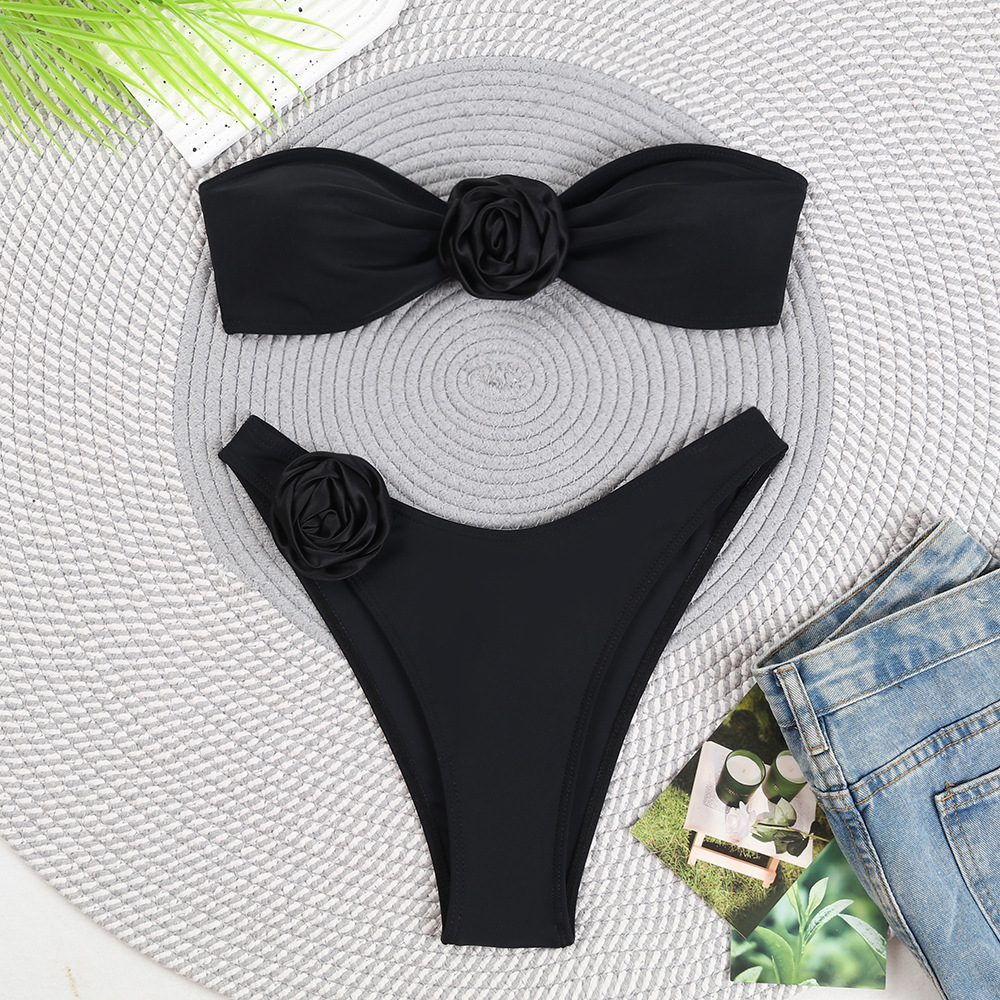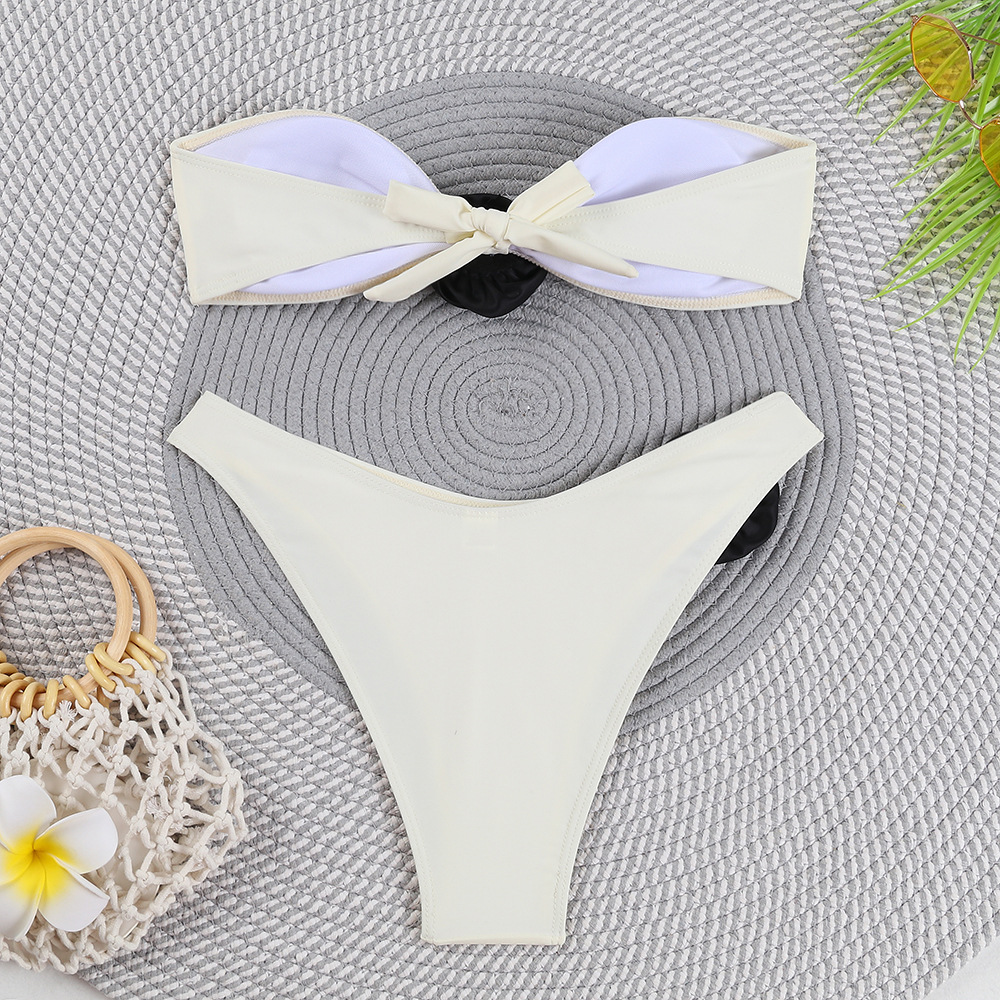 2024年新款简约性感纯色花朵欧美分体比基尼无肩带后背系绳式泳衣