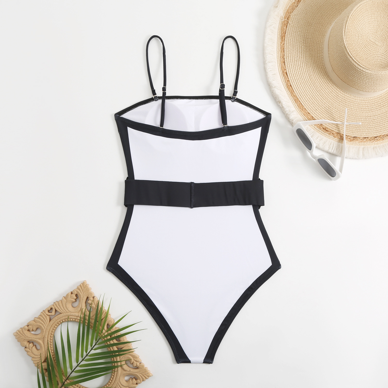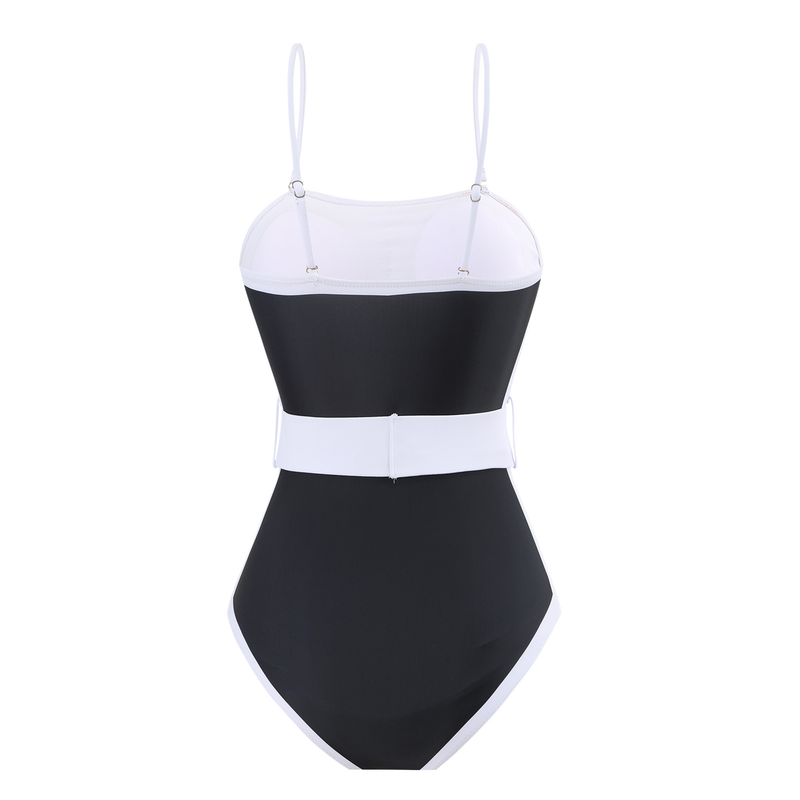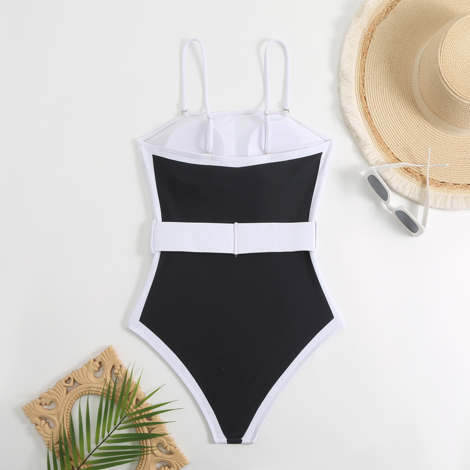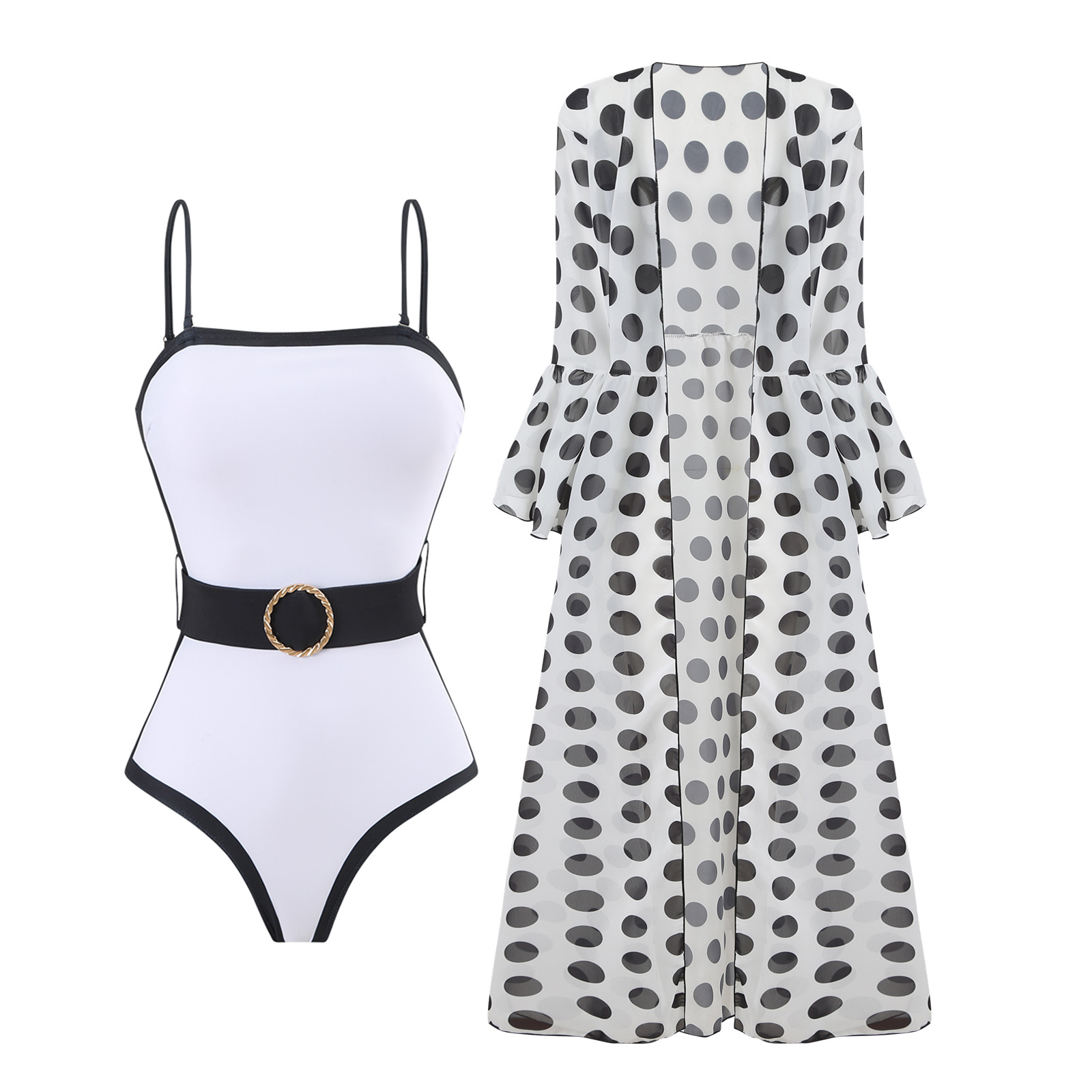 2025爆款欧美新款泳衣女黑白欧美腰带时尚性感连体泳装雪纺罩衫女