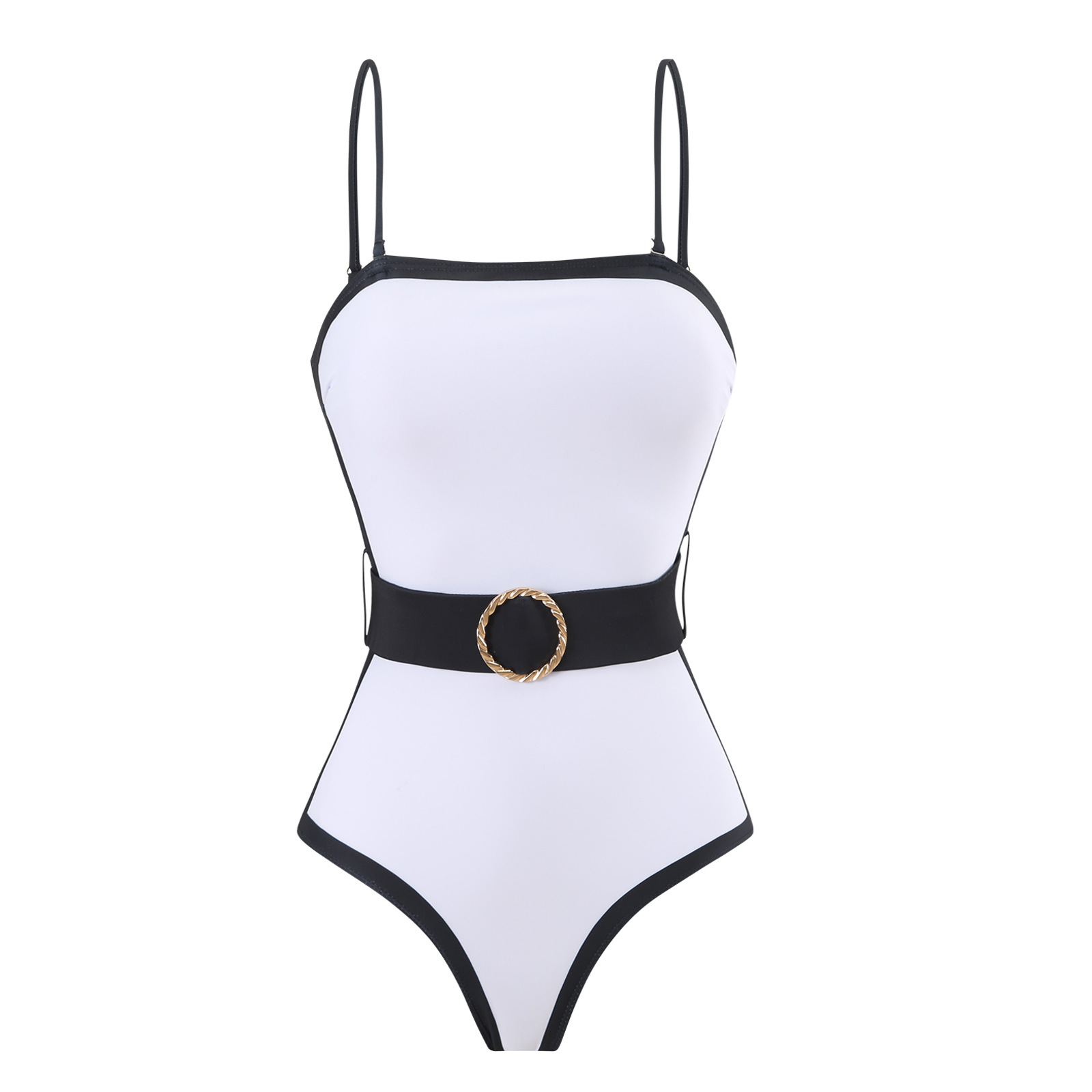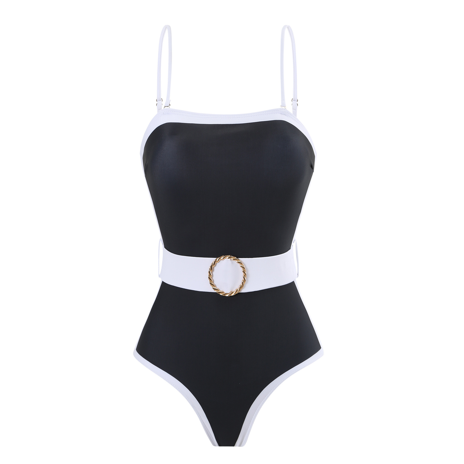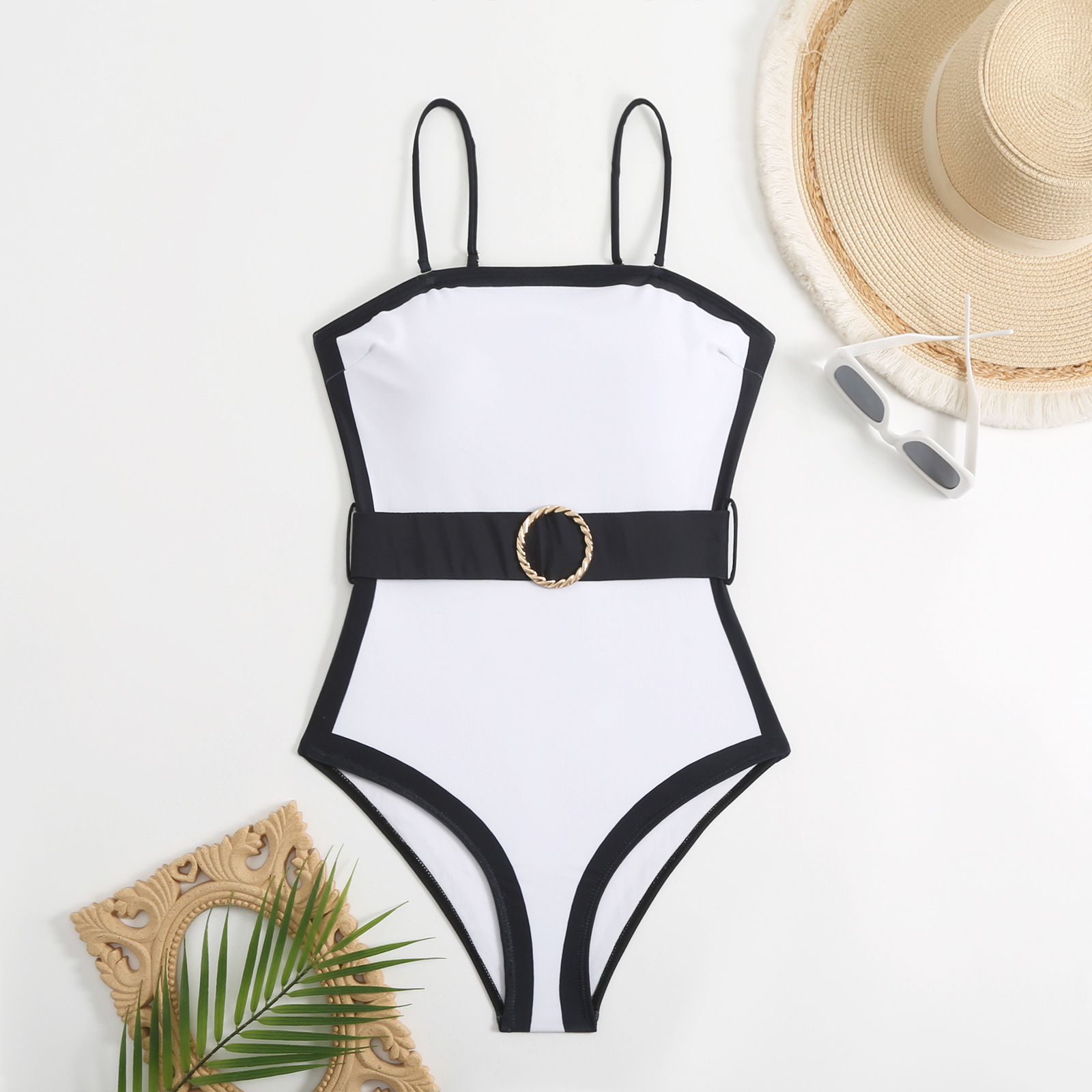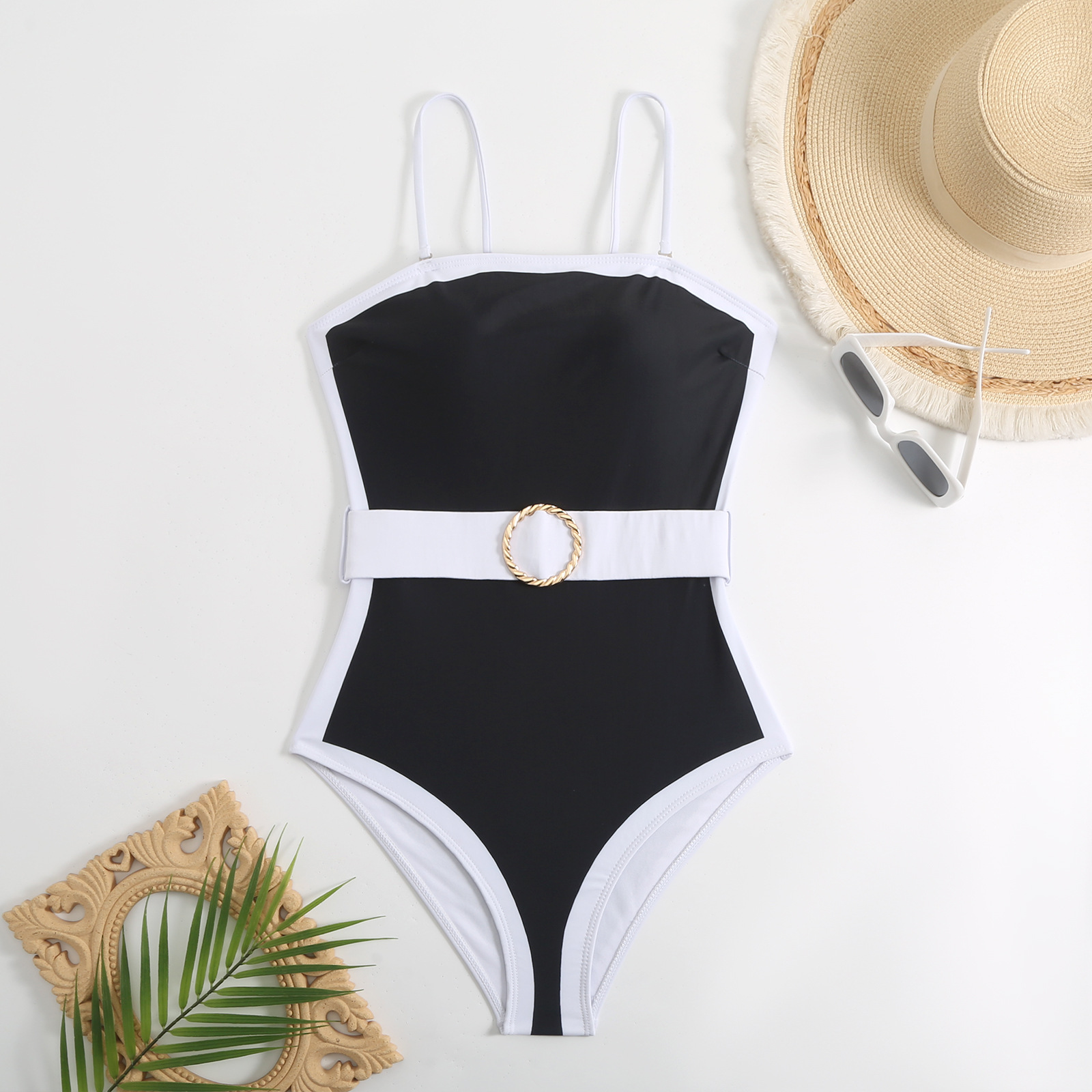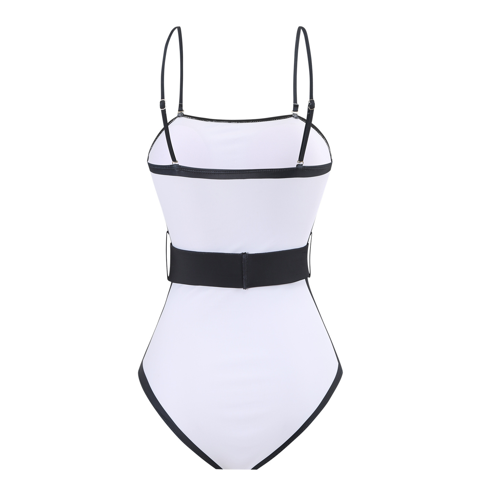2025爆款欧美新款泳衣女黑白欧美腰带时尚性感连体泳装雪纺罩衫女