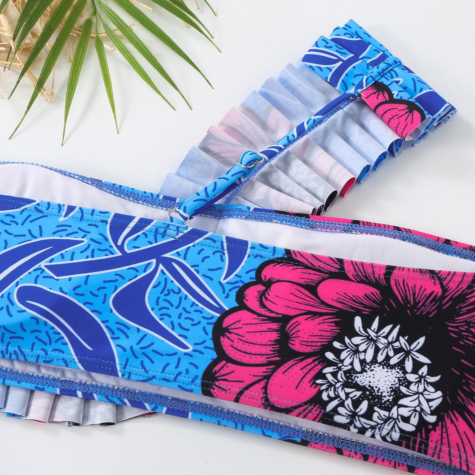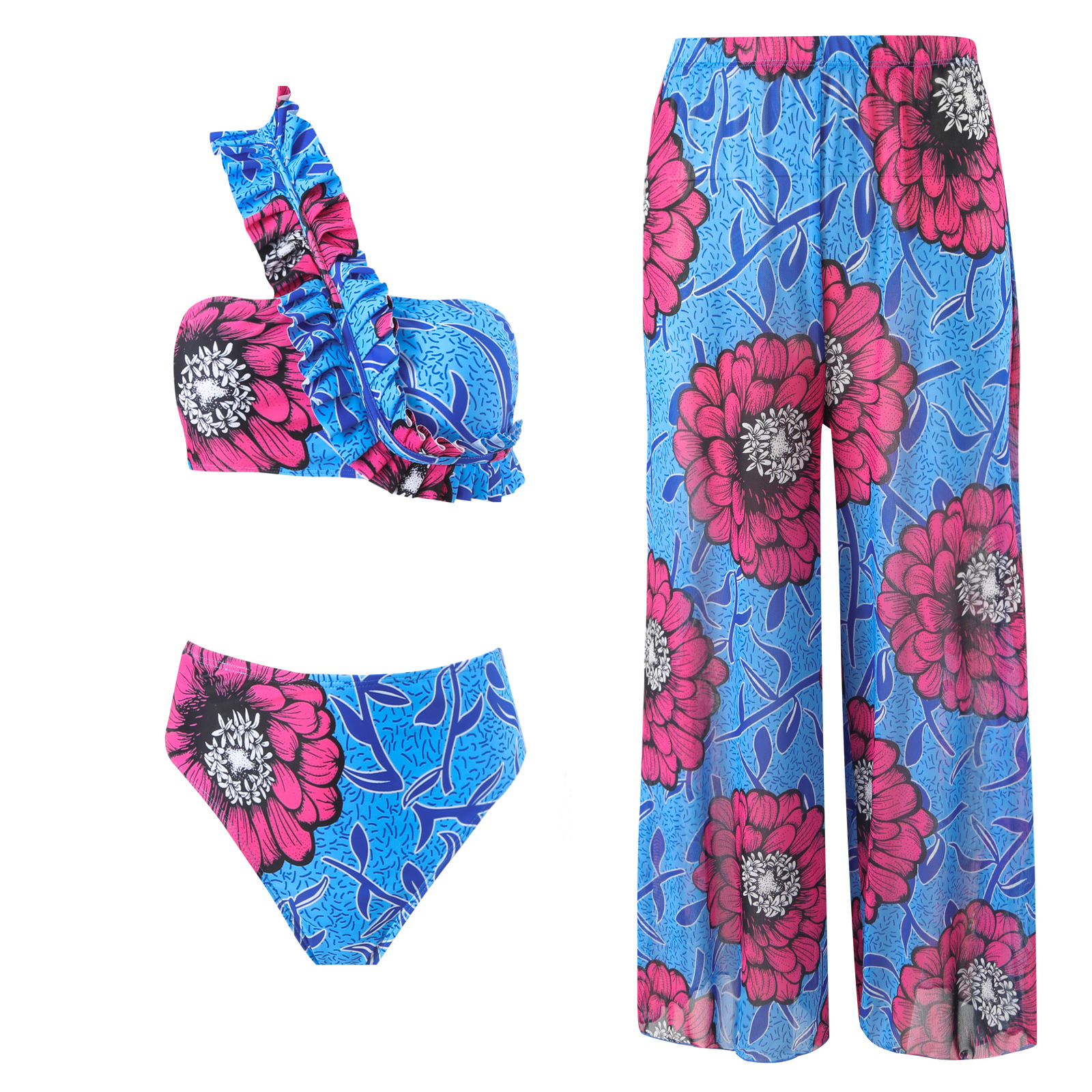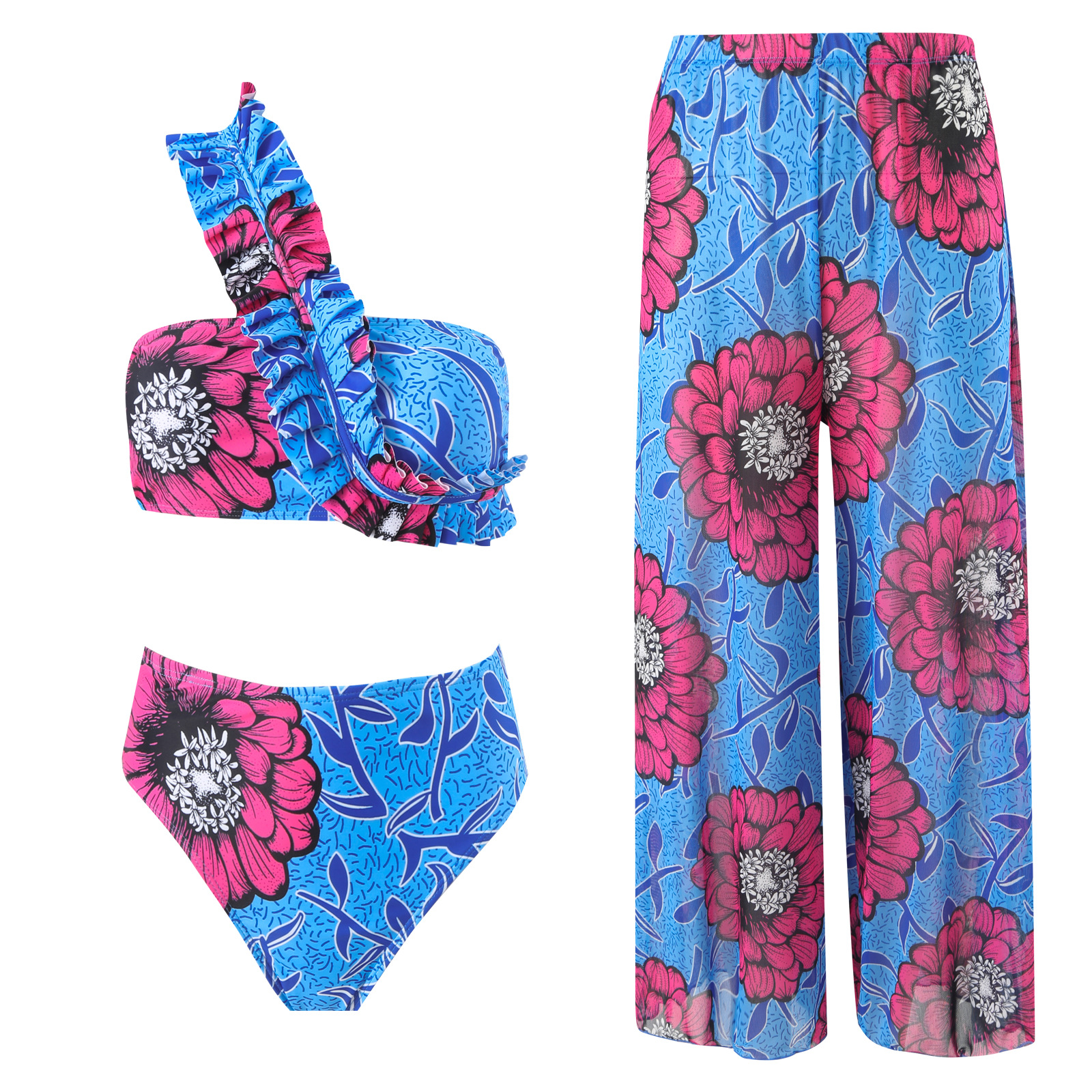 2025跨境新款欧美性感斜肩时尚撞色印花抹胸聚拢bikini三件套长裤