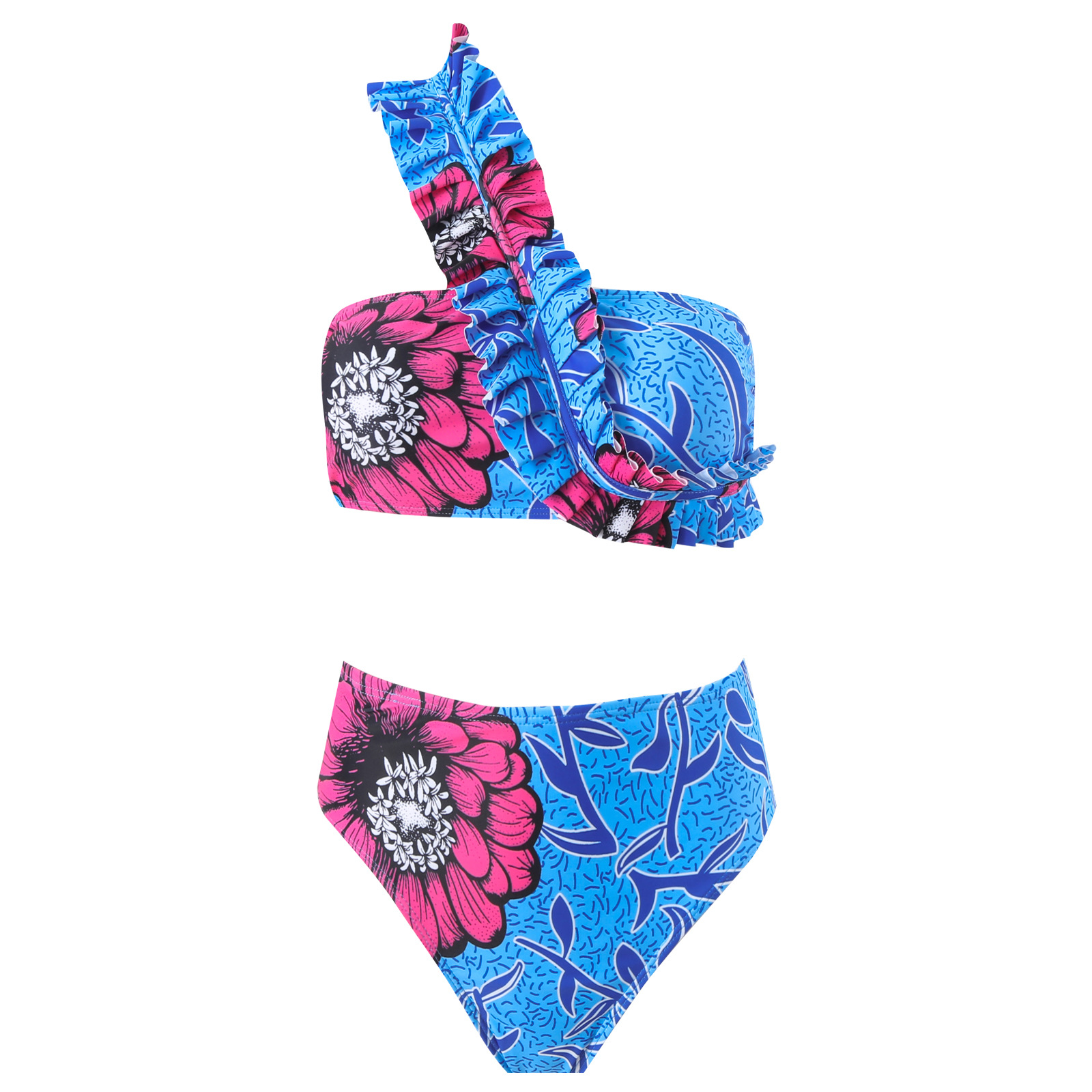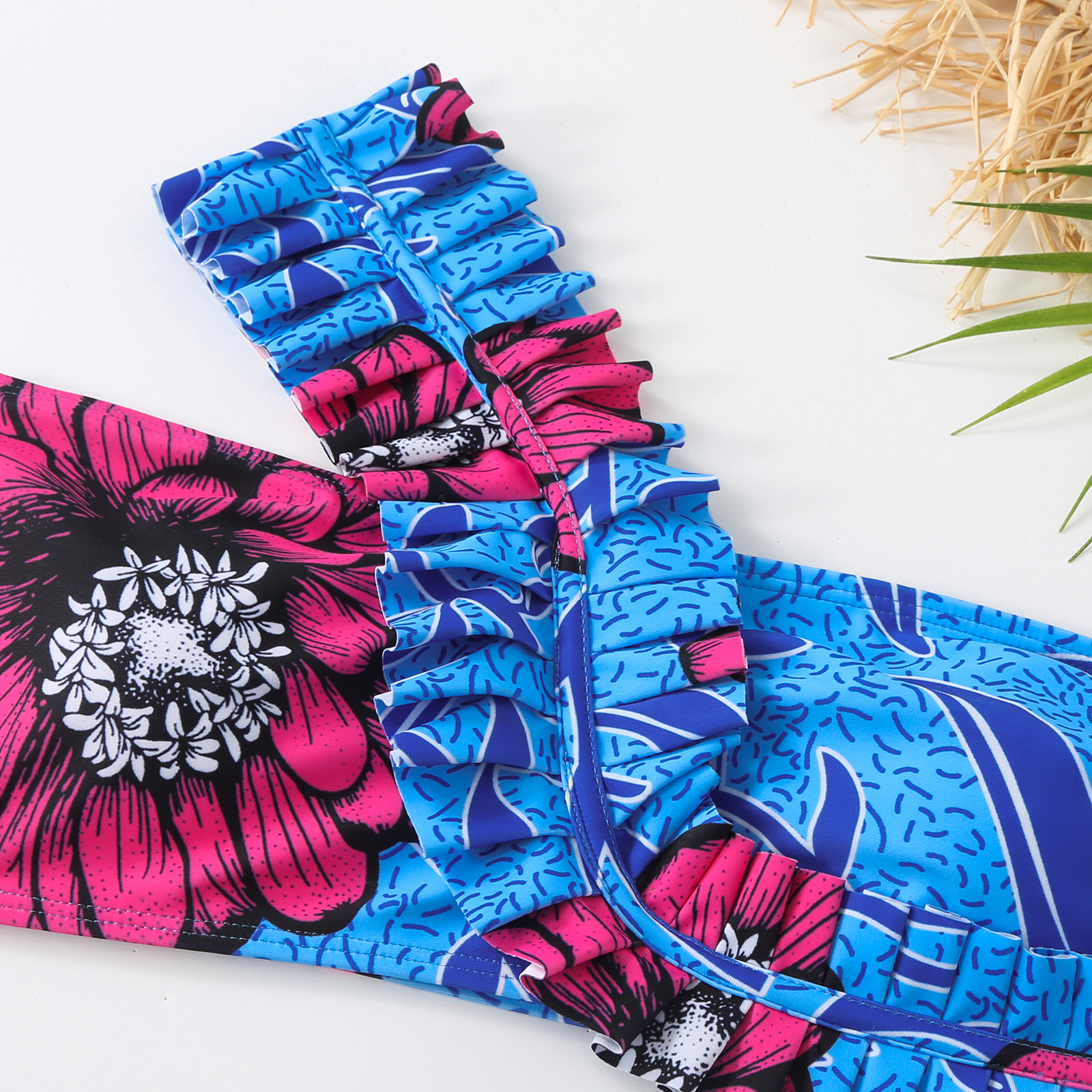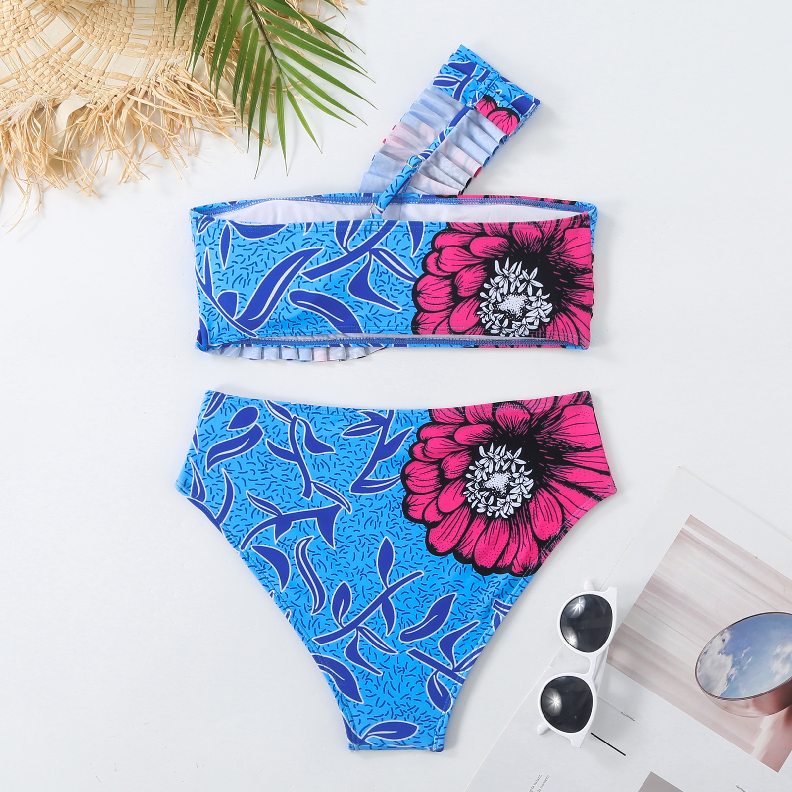 2025跨境新款欧美性感斜肩时尚撞色印花抹胸聚拢bikini三件套长裤