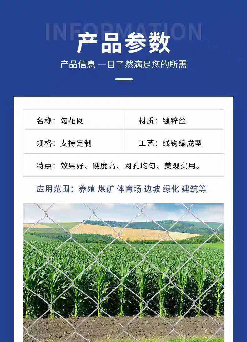 - 规格:热镀锌45号弹簧钢丝3.0粗7公分孔2.0米高10米长