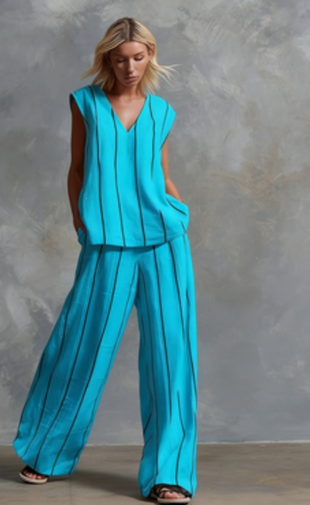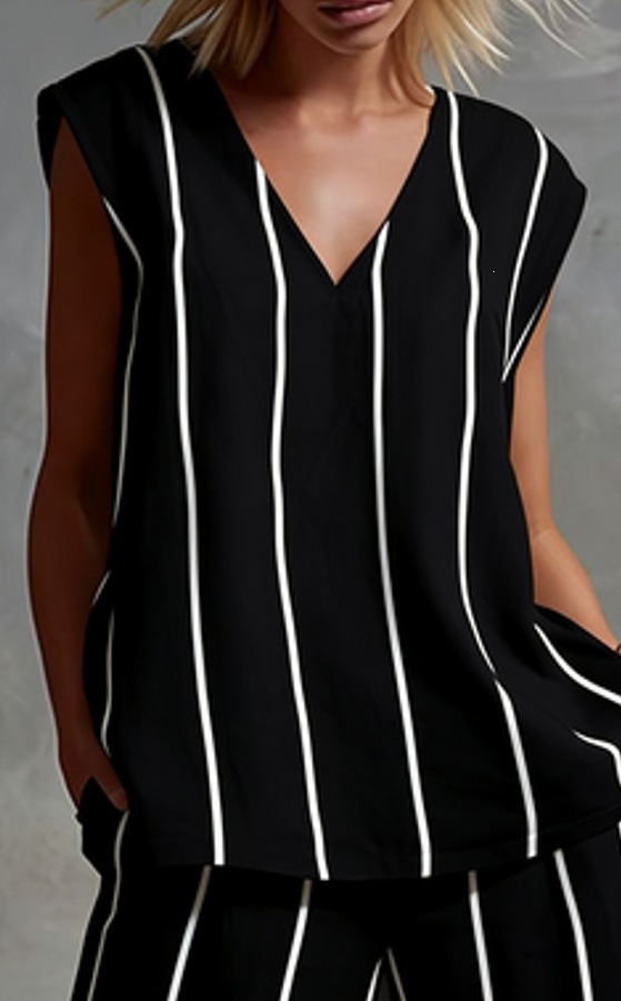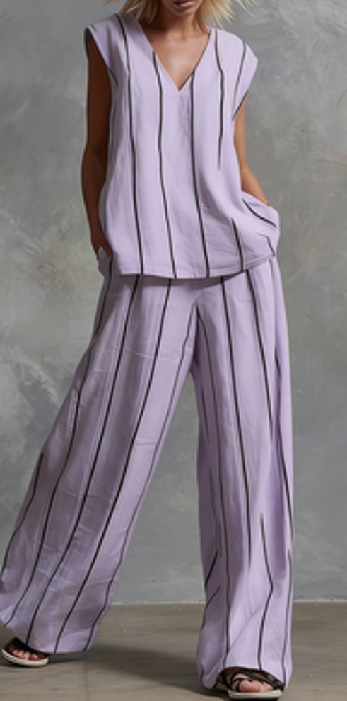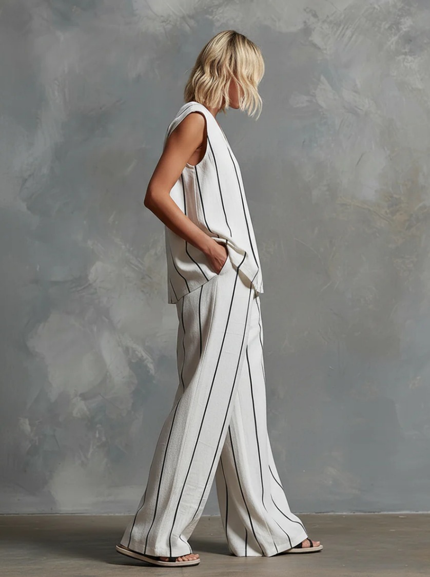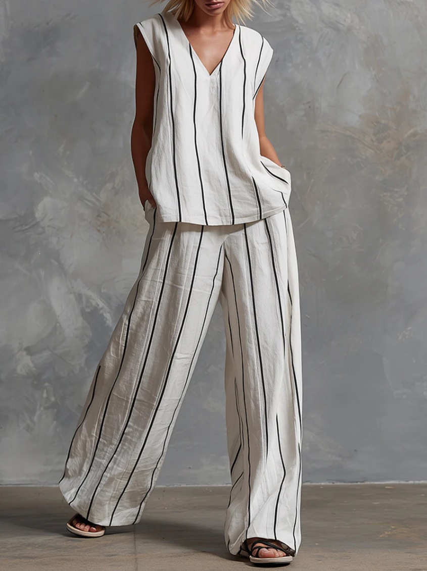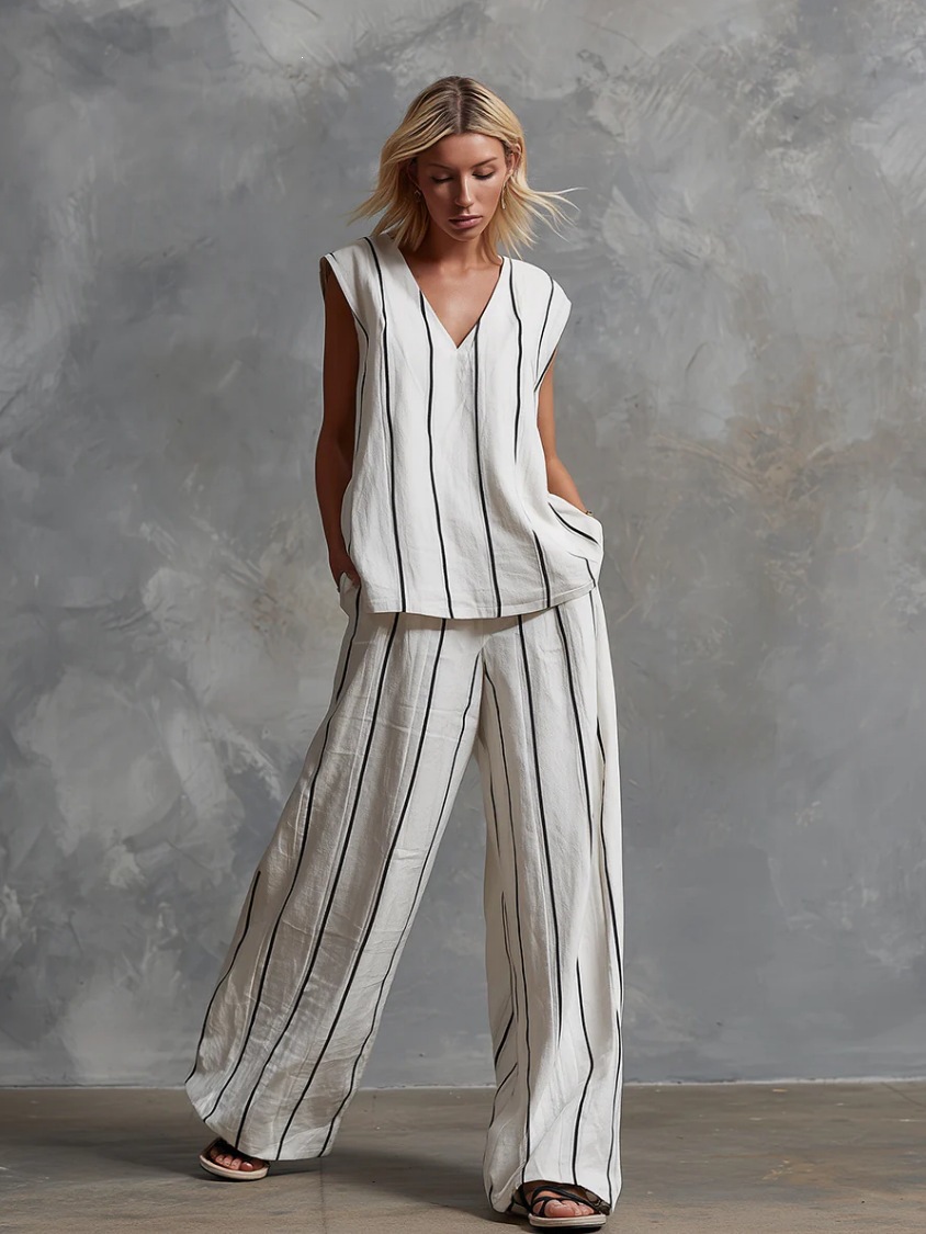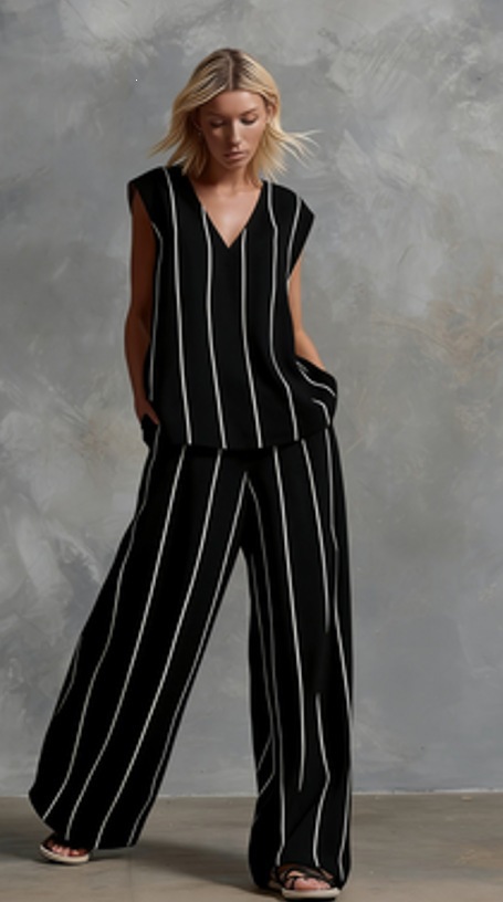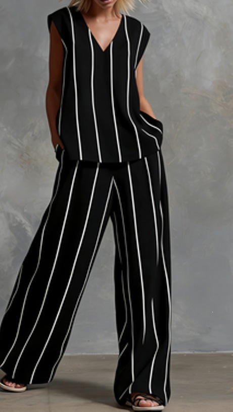 2026跨境欧美亚马逊 黑白竖条纹宽松显瘦棉麻套装阔腿裤两件套