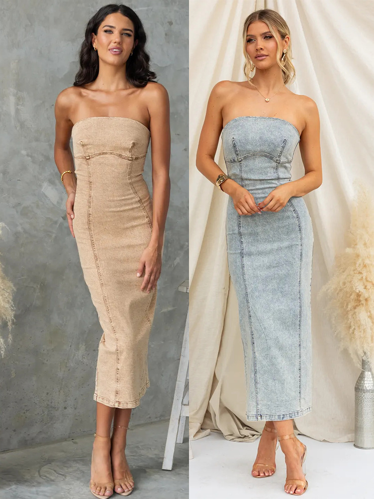 欧美跨境亚马逊女装新款裹胸性感辣妹拼接修身牛仔连衣裙独立站