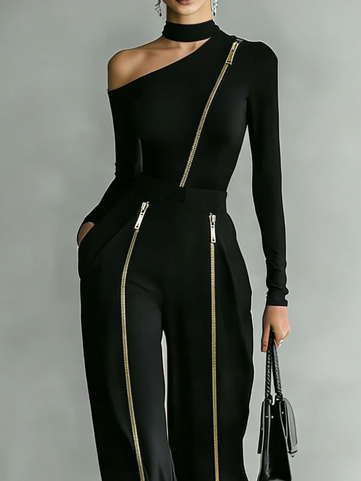 2026欧美西裤双拉链个性裤子加潮露肩长袖上衣时尚 套装女