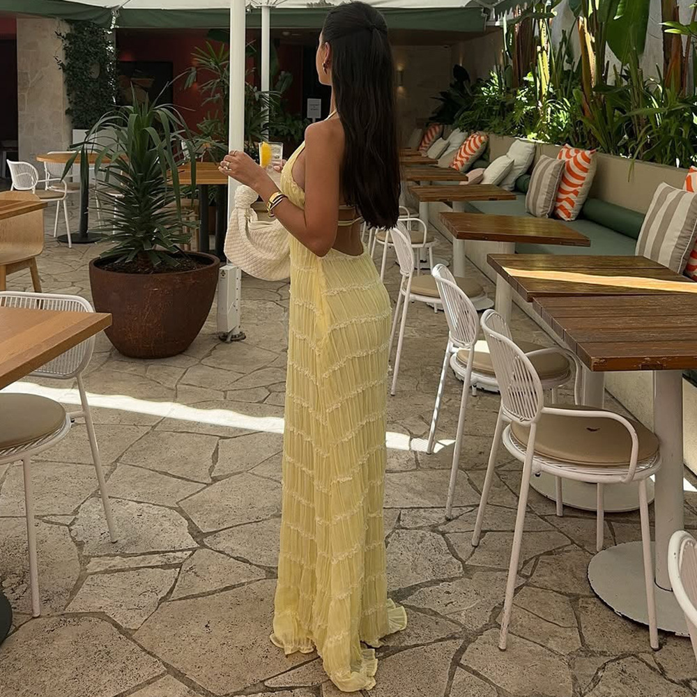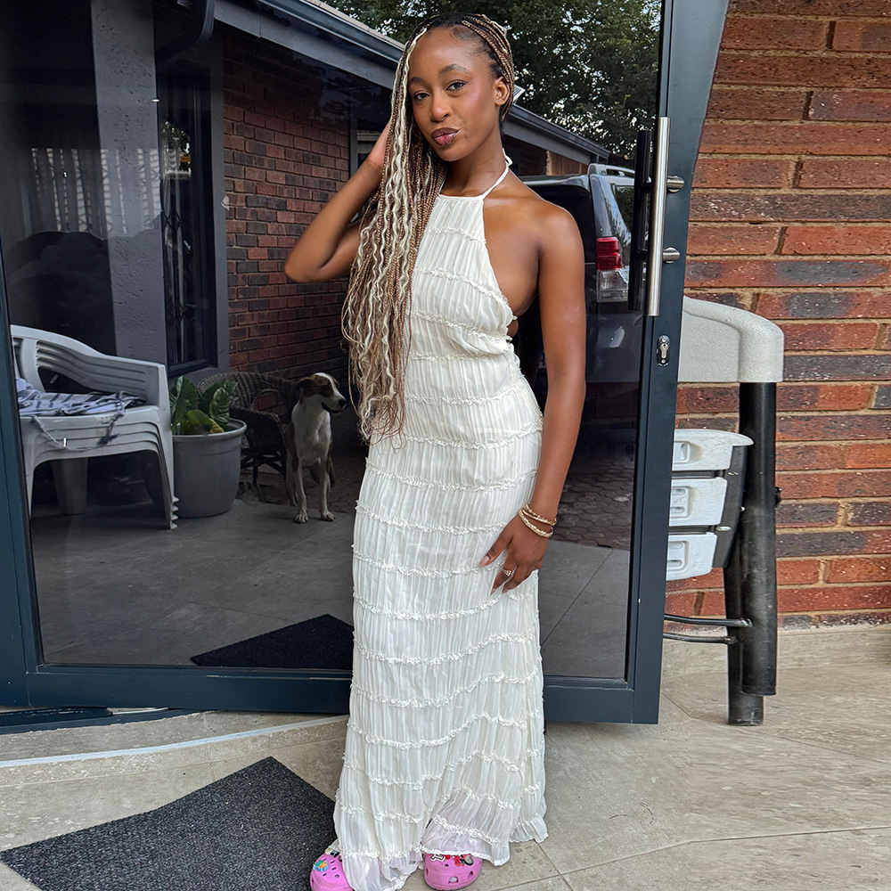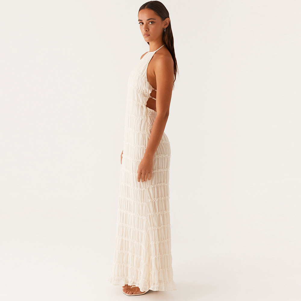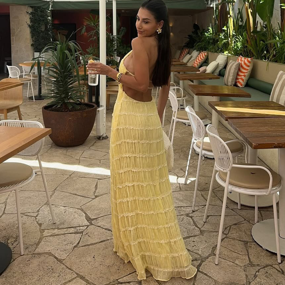 欧美外贸女露背褶皱条面料个性连衣裙新品透气系带荷叶 长裙