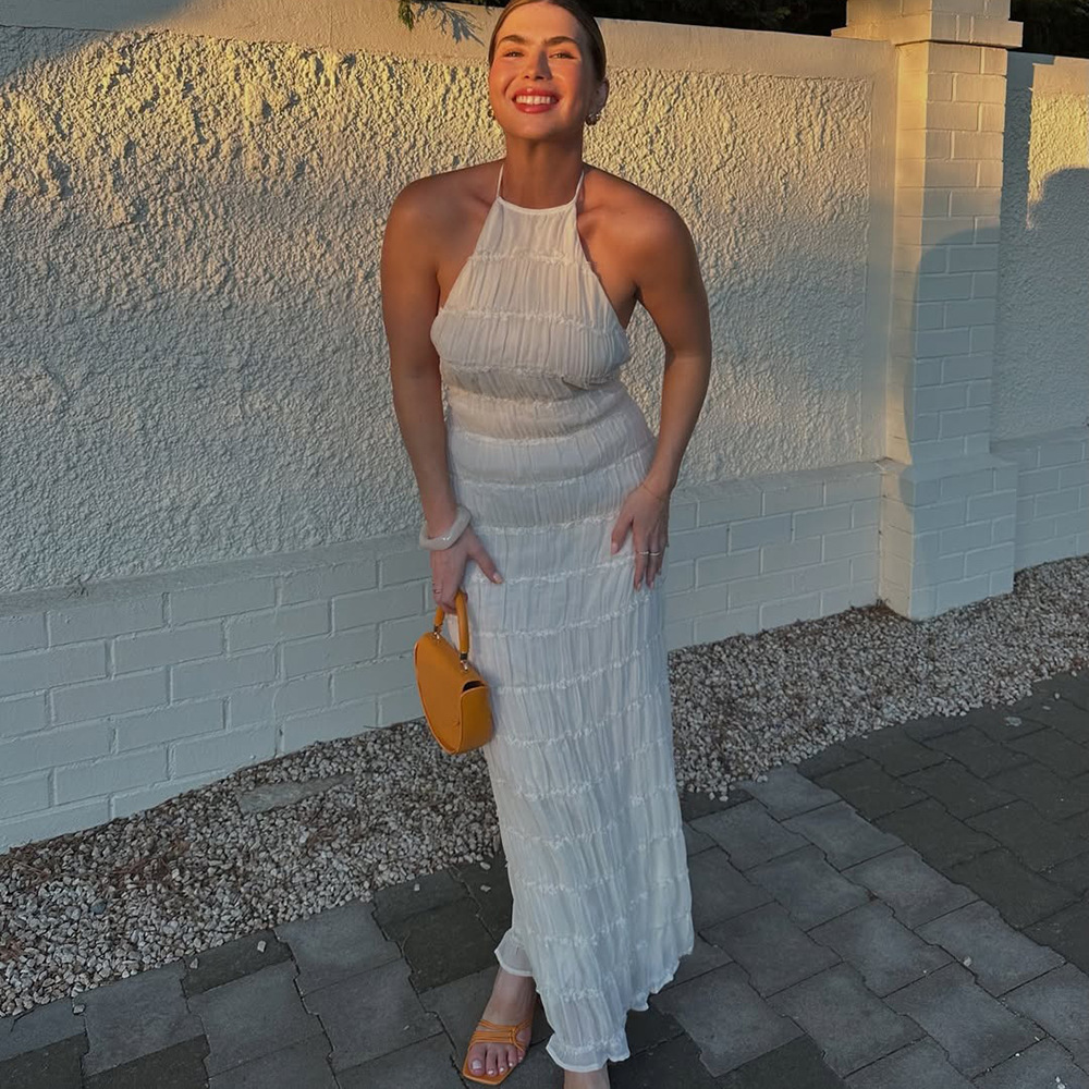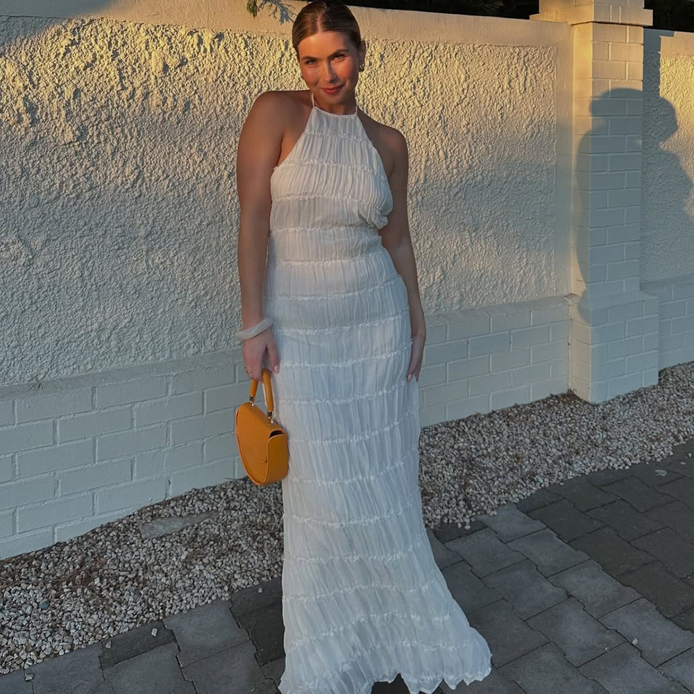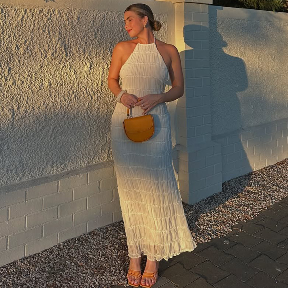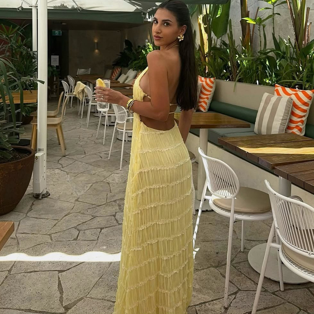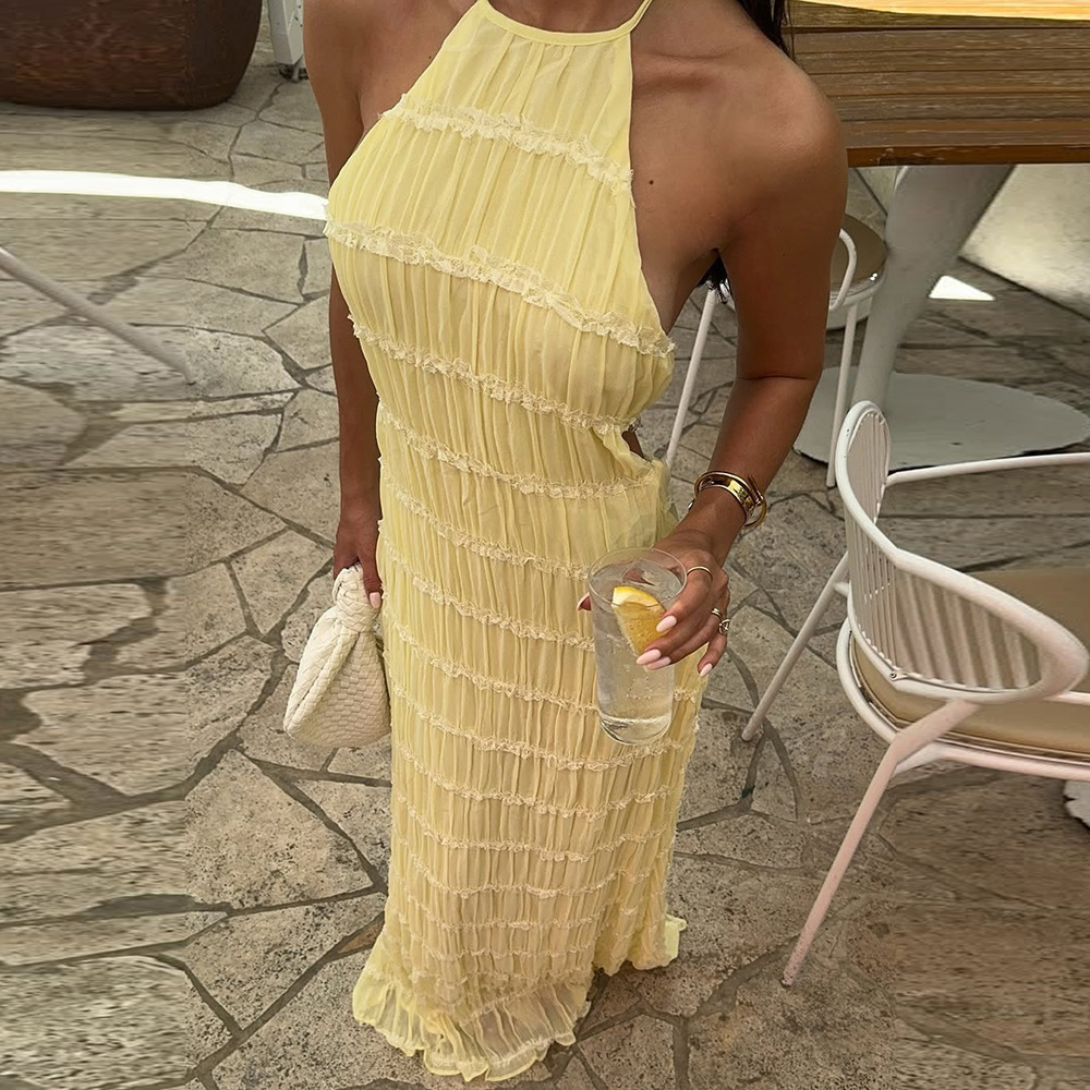 欧美外贸女露背褶皱条面料个性连衣裙新品透气系带荷叶 长裙