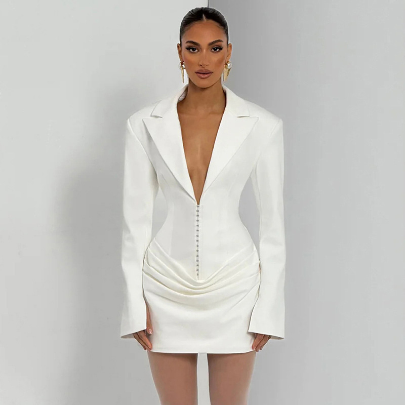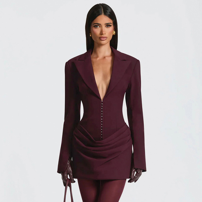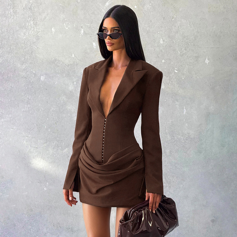 2025欧美女装秋冬新款气质纯色深 V翻领褶皱迷你收腰连衣裙女