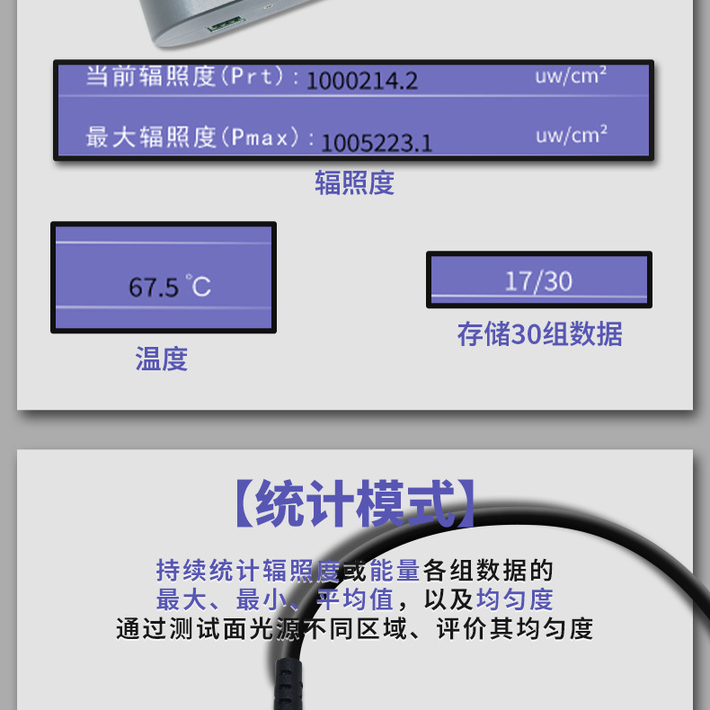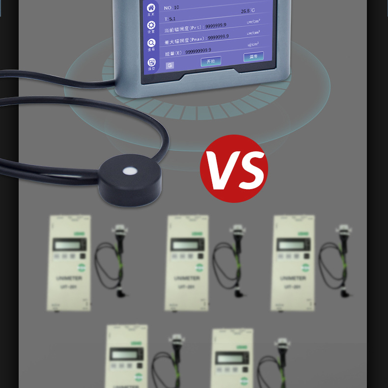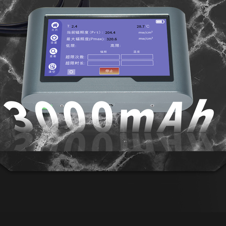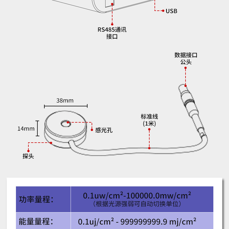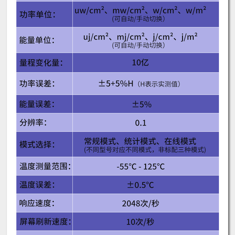 - 测量范围:0.1uw/cm²-10万mw/cm²