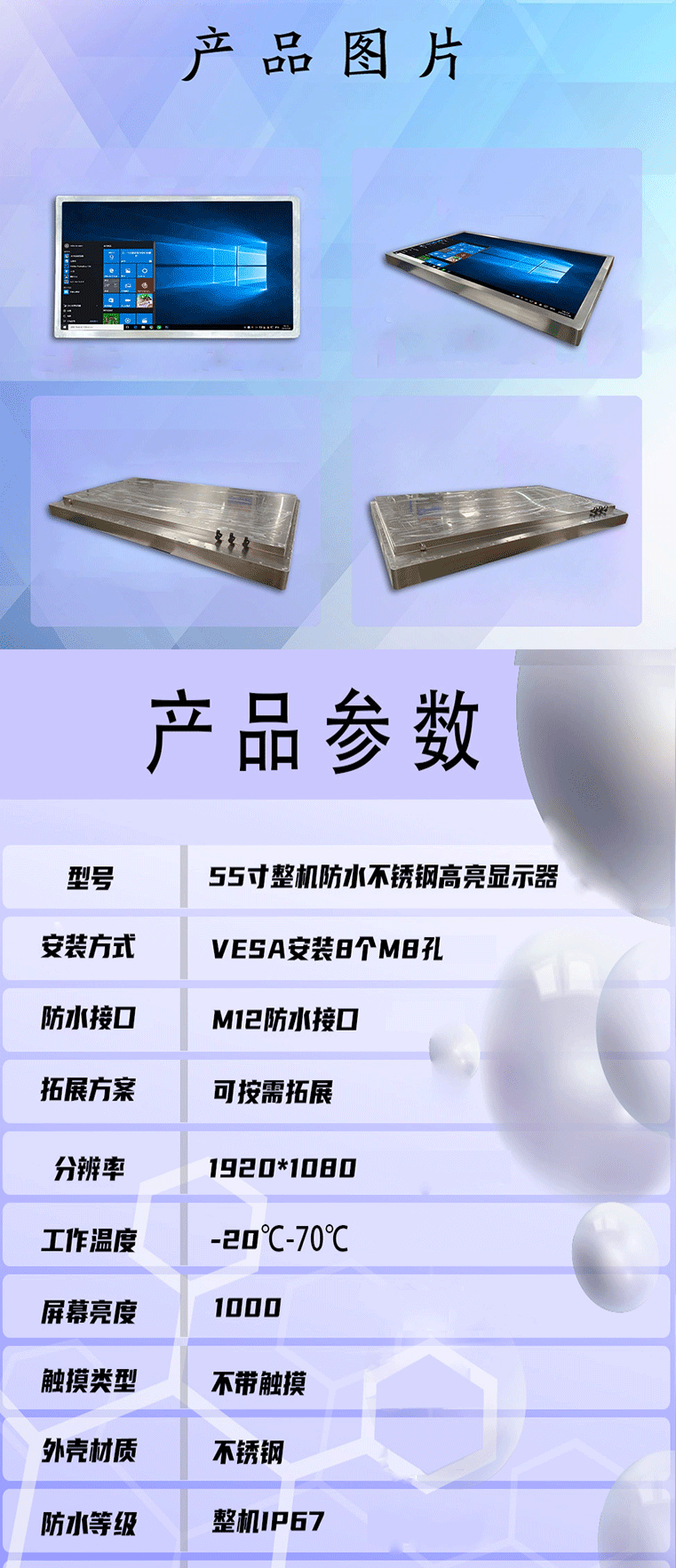 - 尺寸:55寸整机不锈钢防水显示器