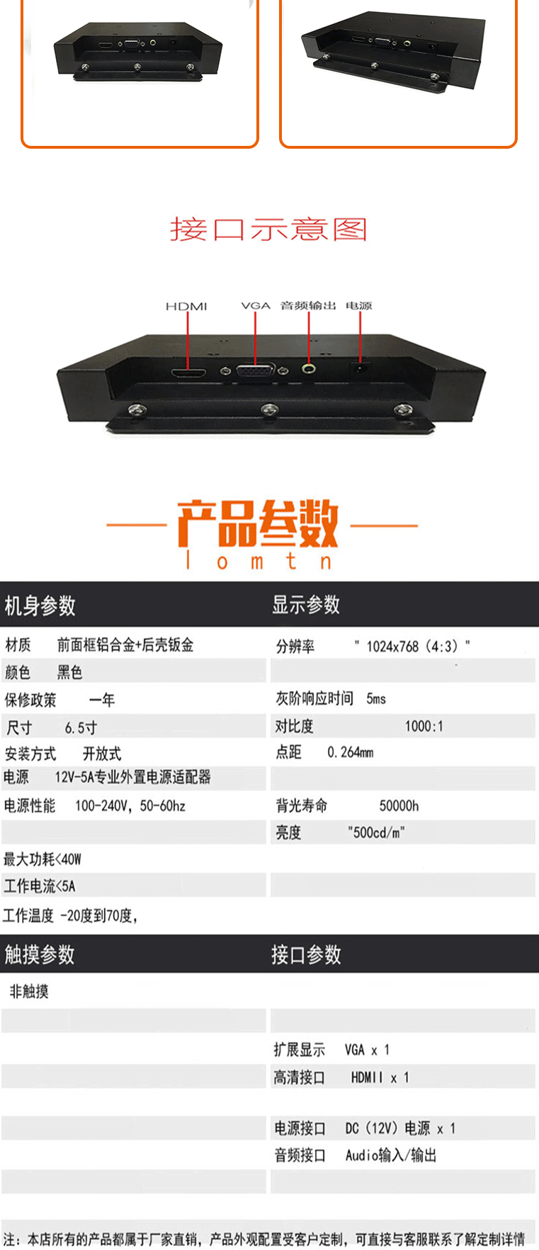 工业显示器6.5寸内外嵌入式车载防震防水特种矿车叉车工控监视器