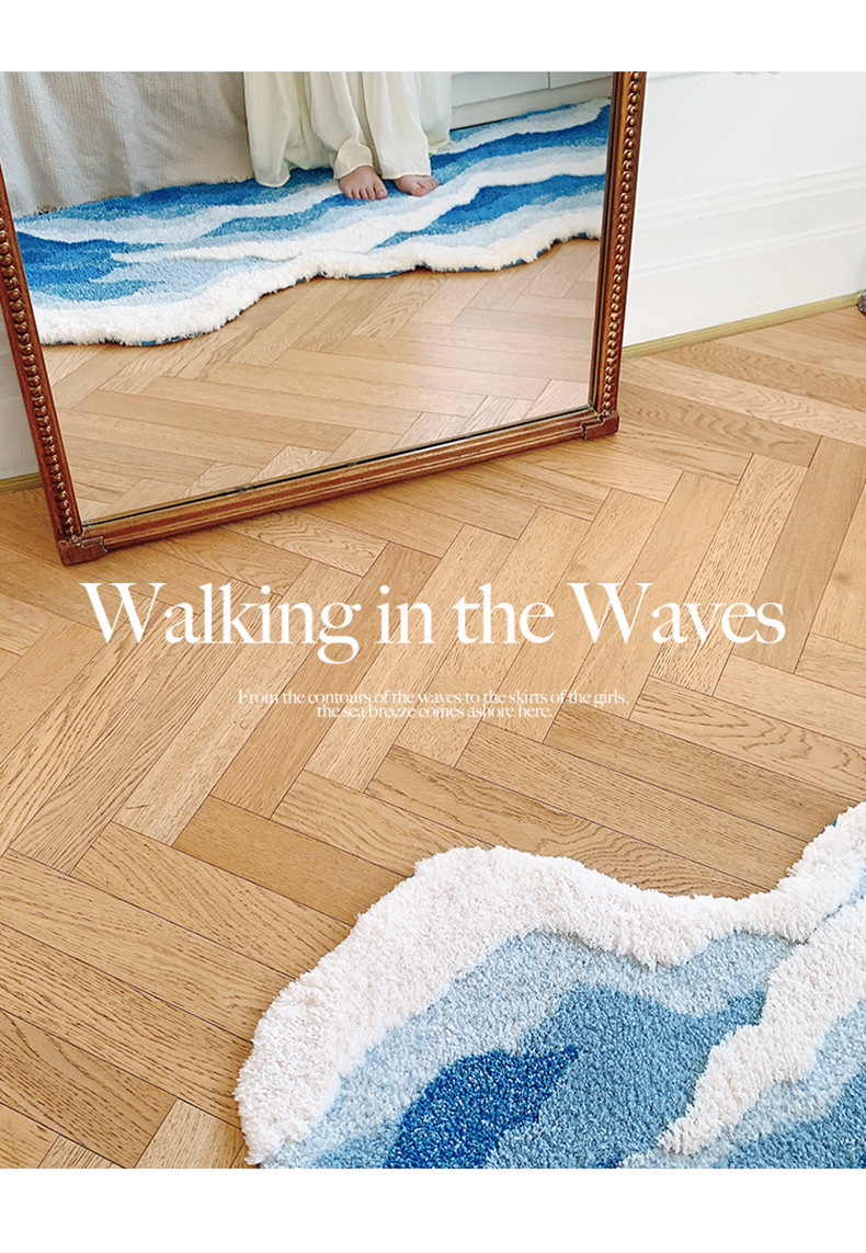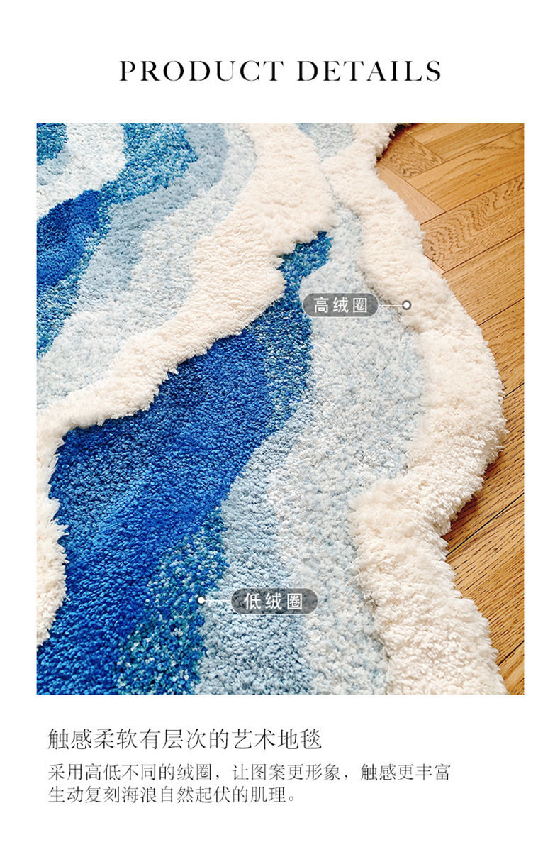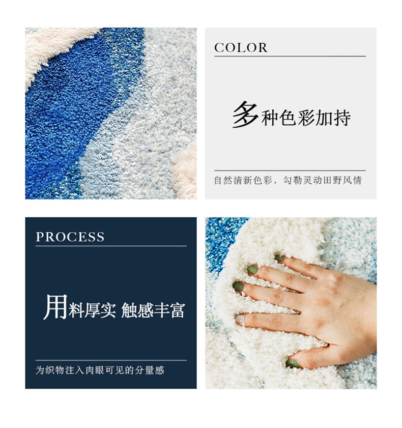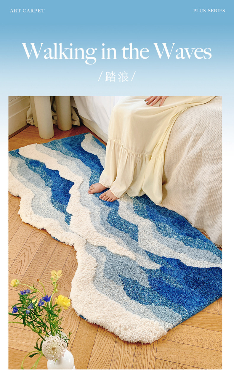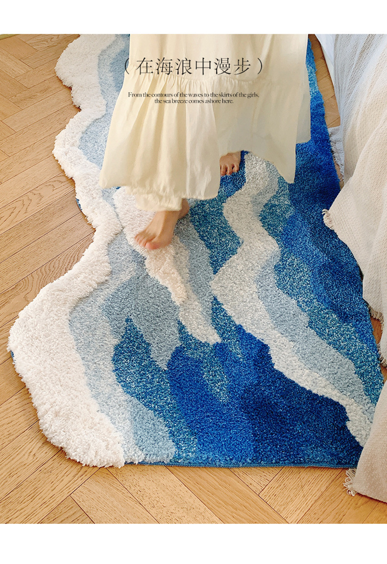 海浪地毯北欧床前毯植绒床边毯茶几防滑蓝色异形客厅卧室脚垫地垫
