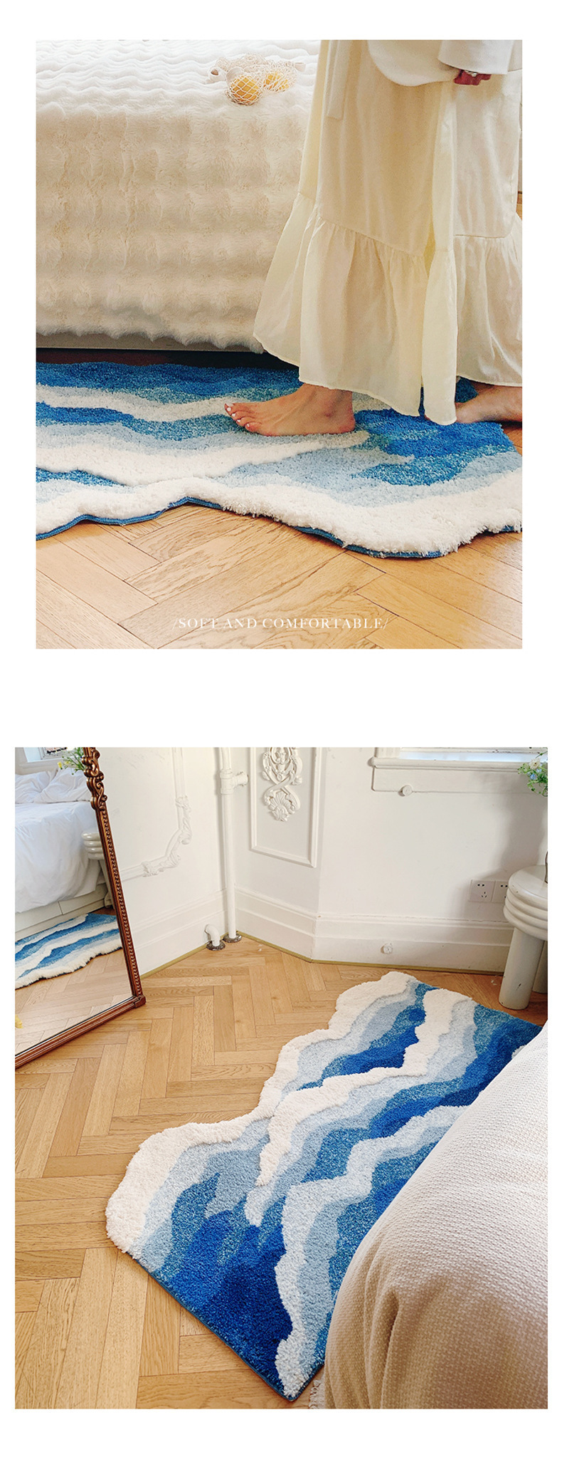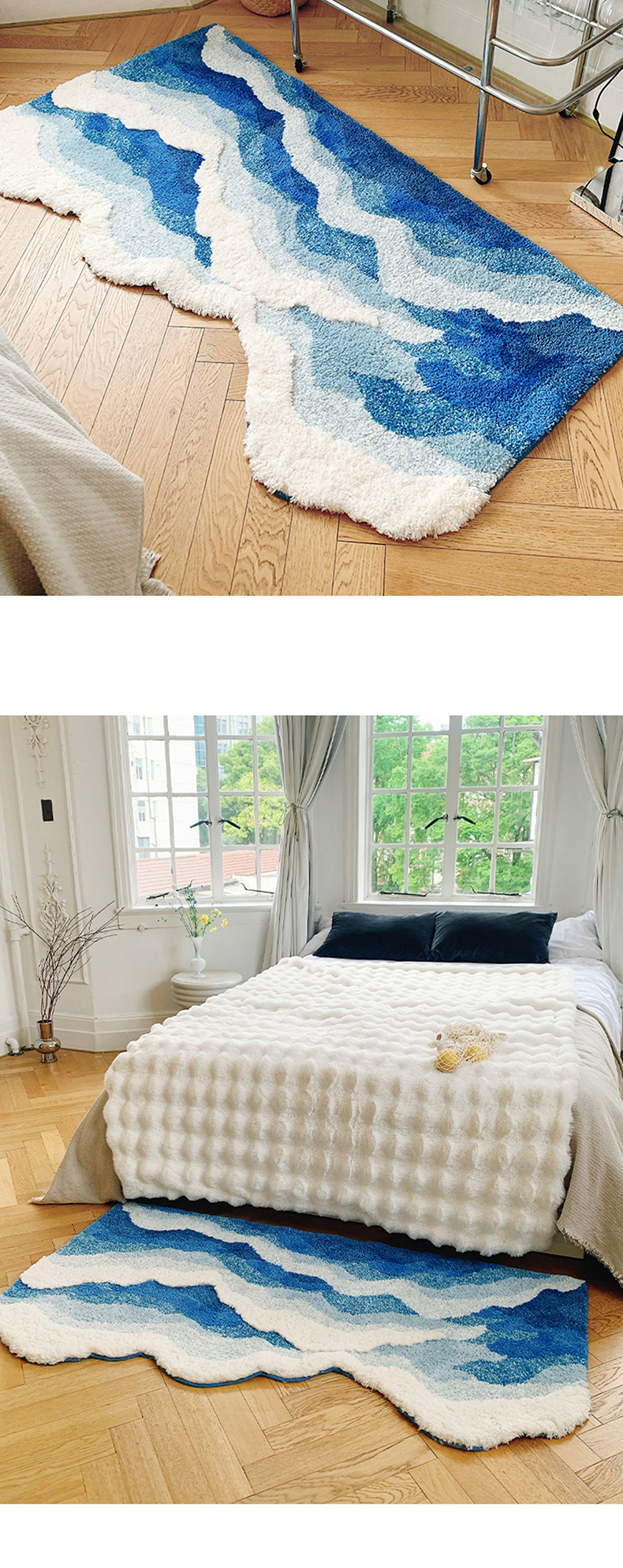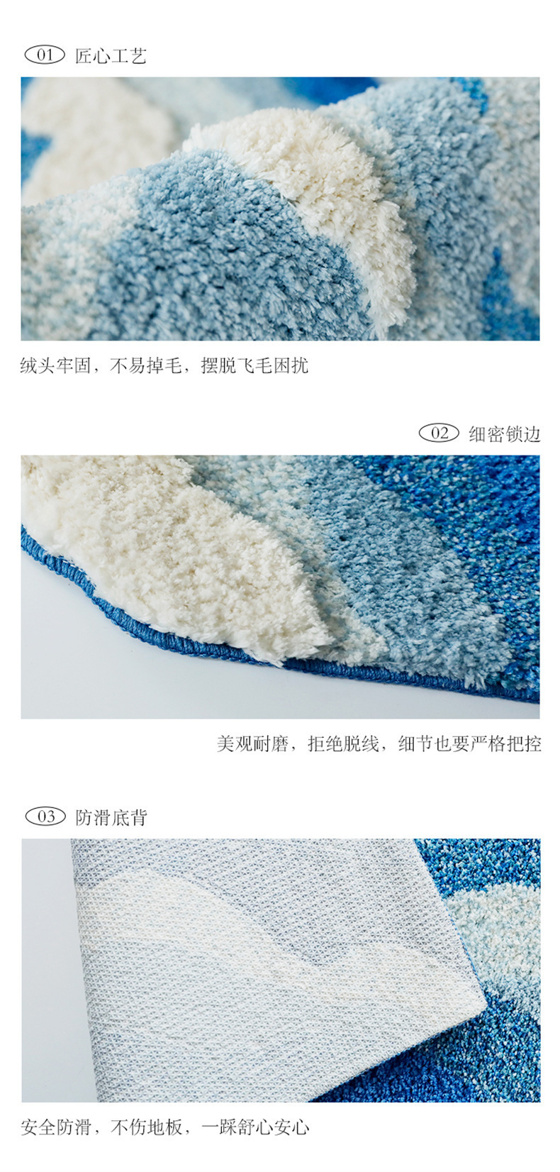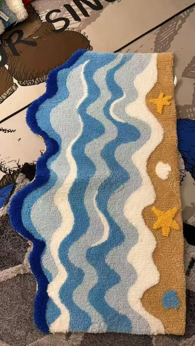 海浪地毯北欧床前毯植绒床边毯茶几防滑蓝色异形客厅卧室脚垫地垫