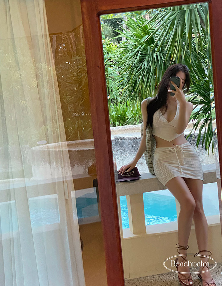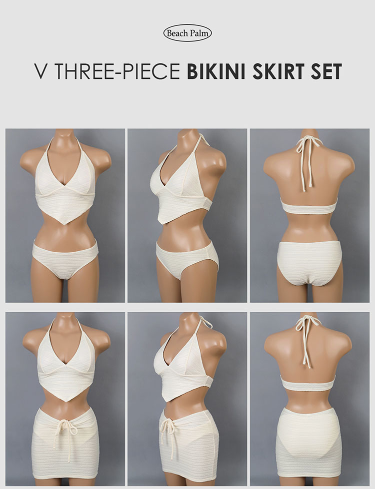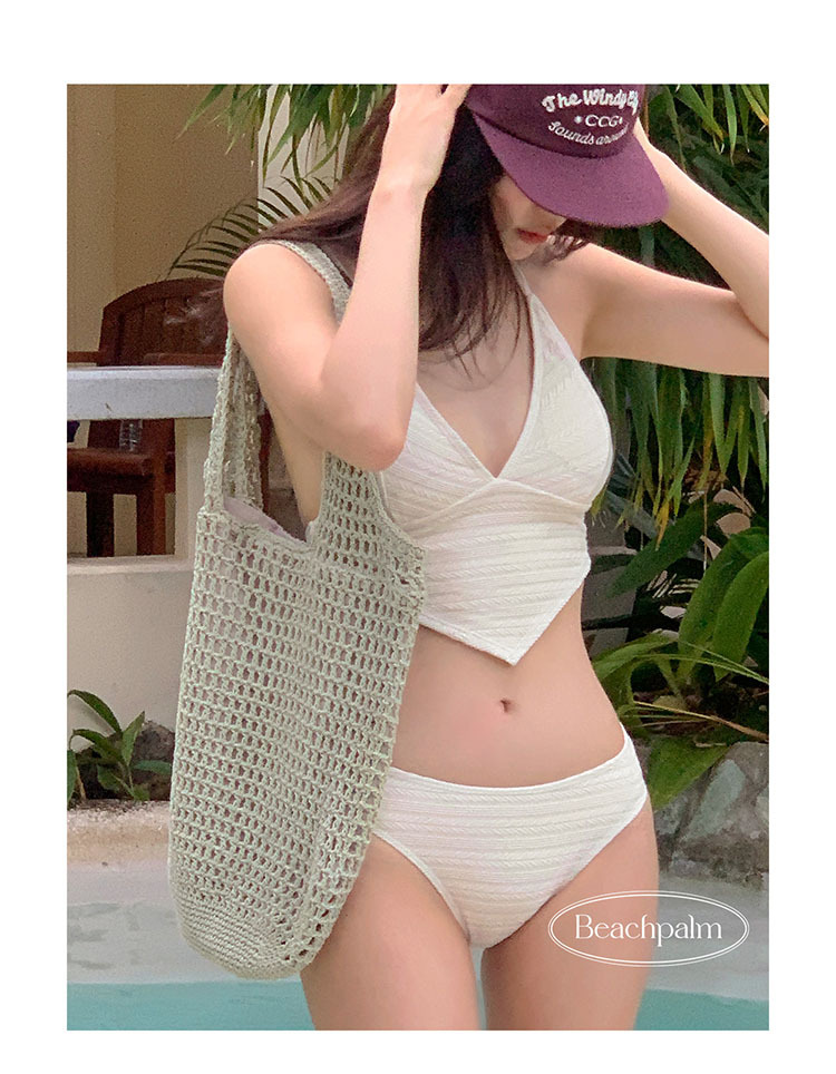 米色纯欲比基尼高级紧身聚拢挂脖系绳遮肚显瘦分体三件套温泉泳衣