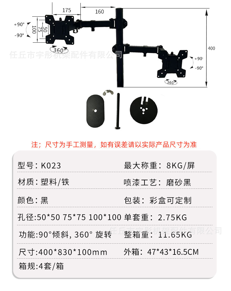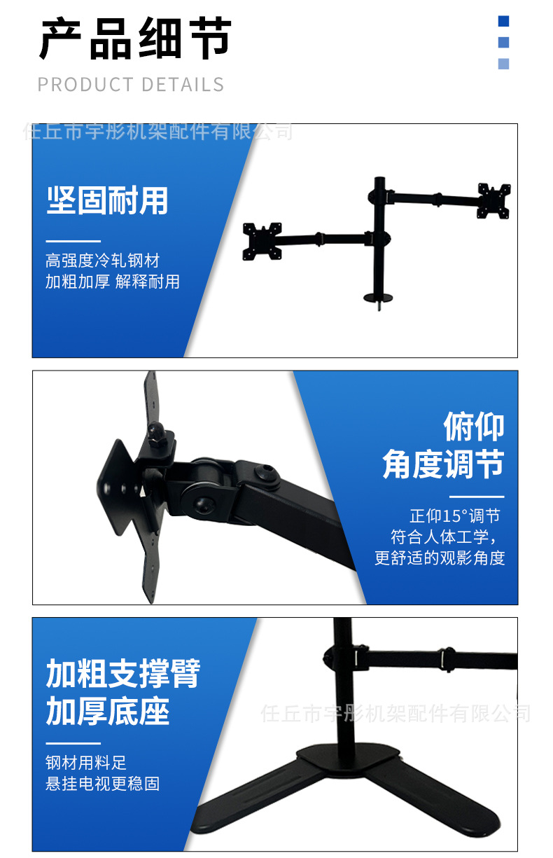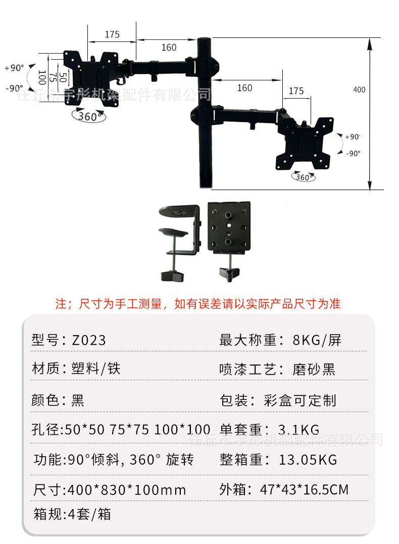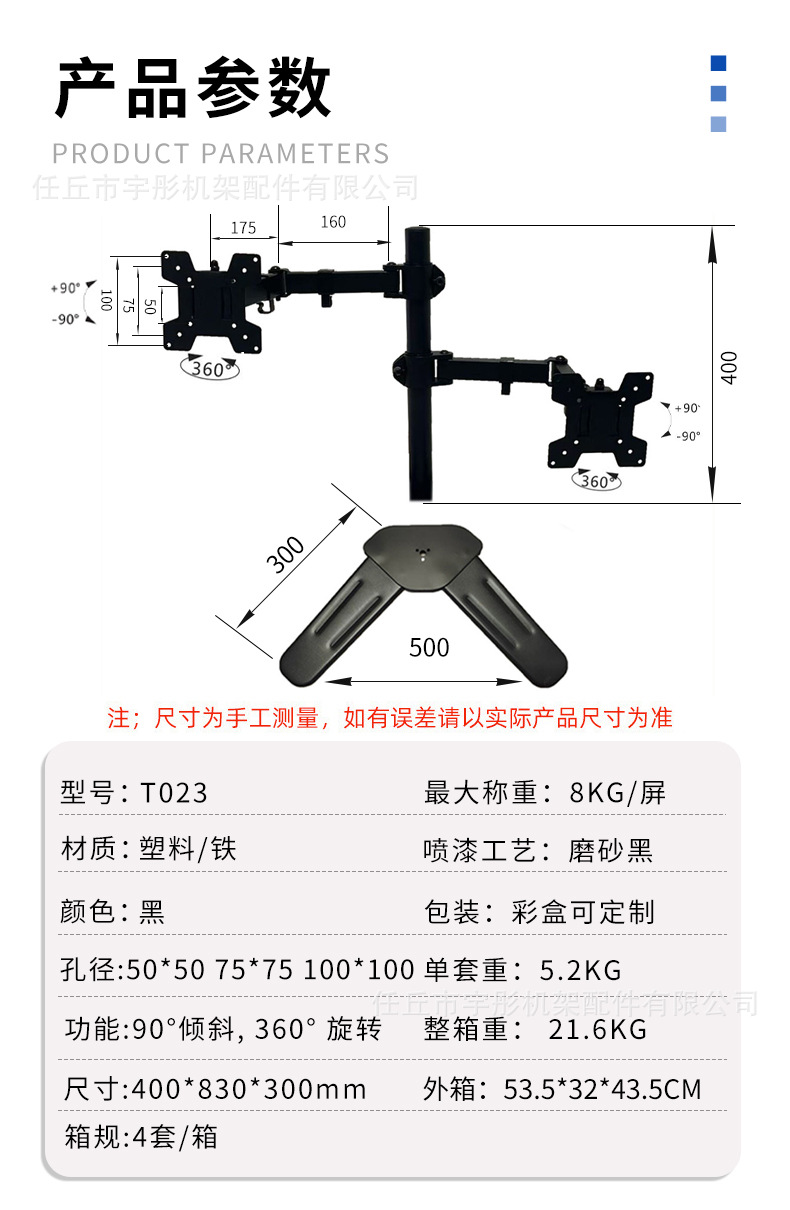 显示器电脑支架多角度可调节90° 倾斜360° 旋转双臂电视机支架