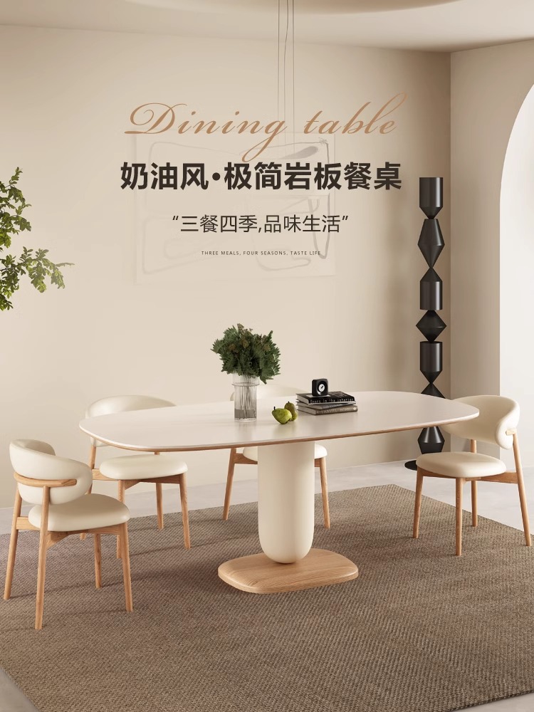 纯白岩板餐桌家用小户型奶油风桌子北欧侘寂风长方形餐桌椅组合
