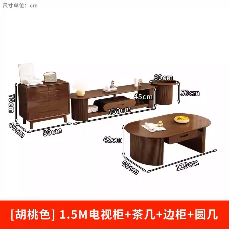 - 颜色:【胡桃色】1.5M电视柜+茶几+边柜+圆几