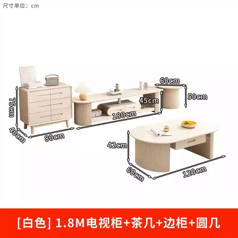 - 颜色:【白色】1.8M电视柜+茶几+边柜+圆几