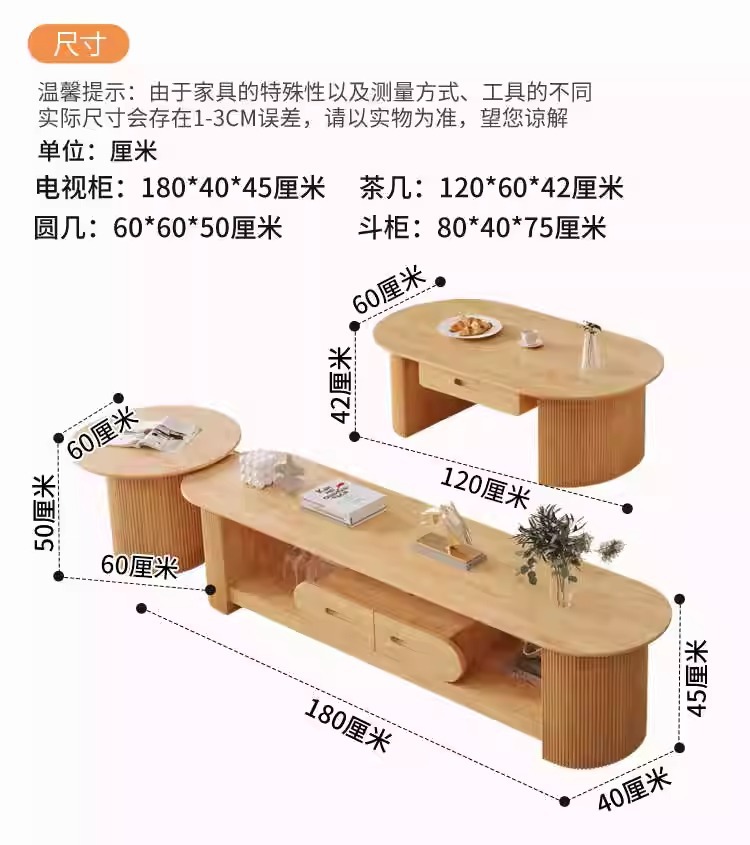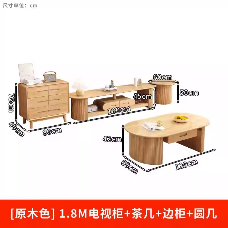 - 颜色:【原木色】1.8M电视柜+茶几+边柜+圆几