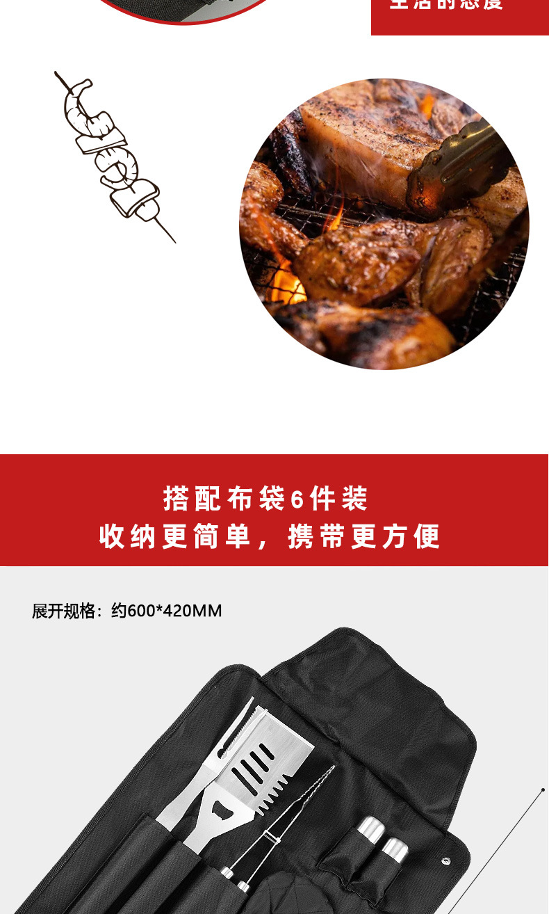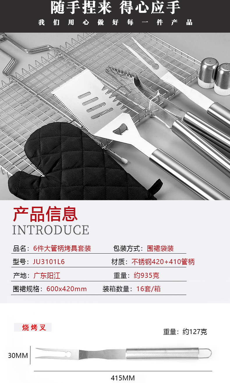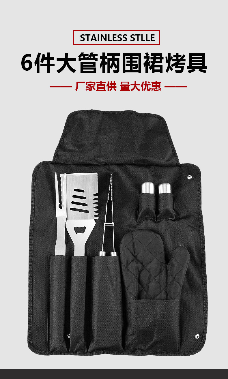 - 规格:6件大管柄烤具套装【围裙袋装】