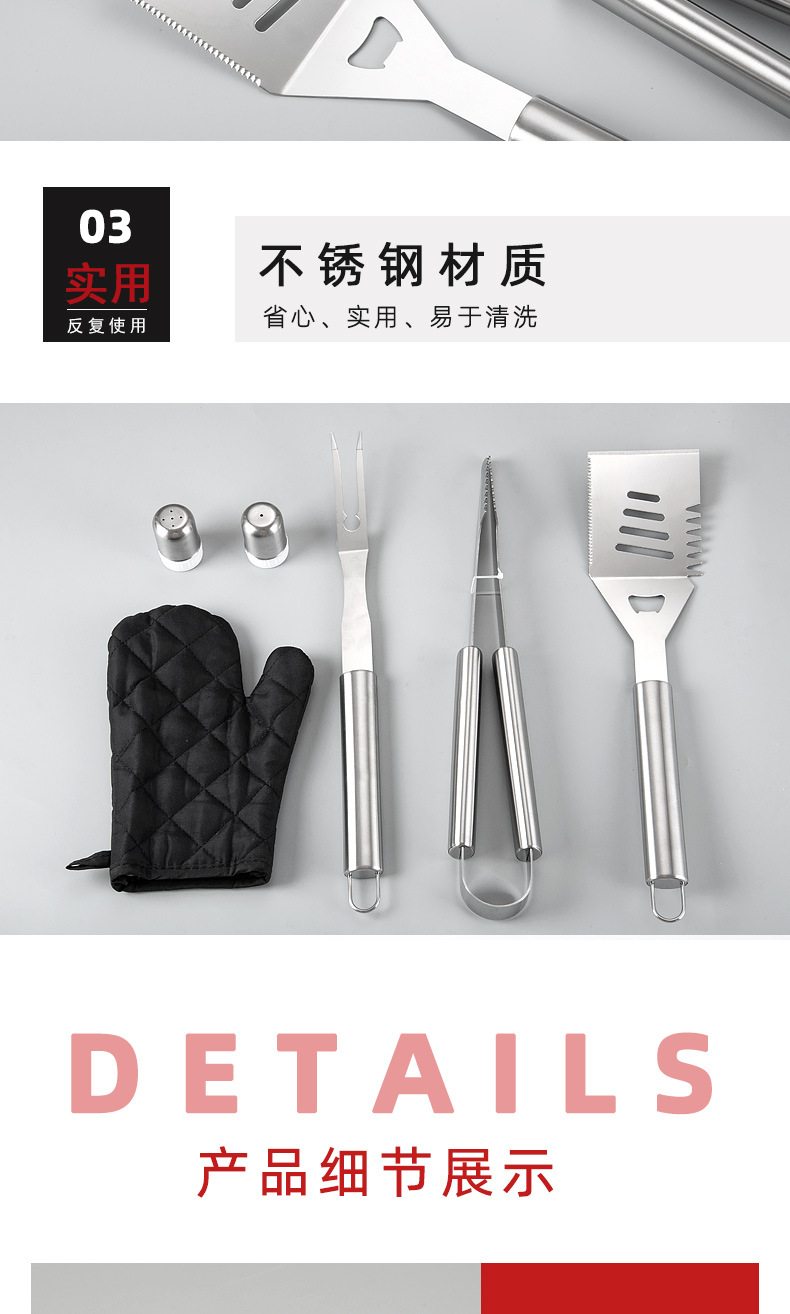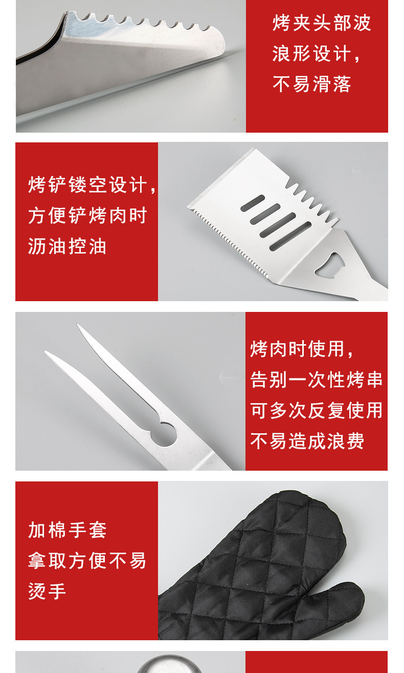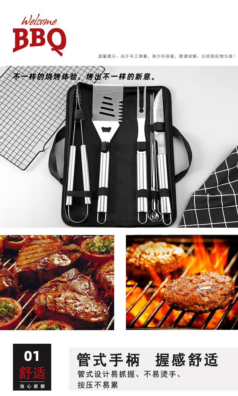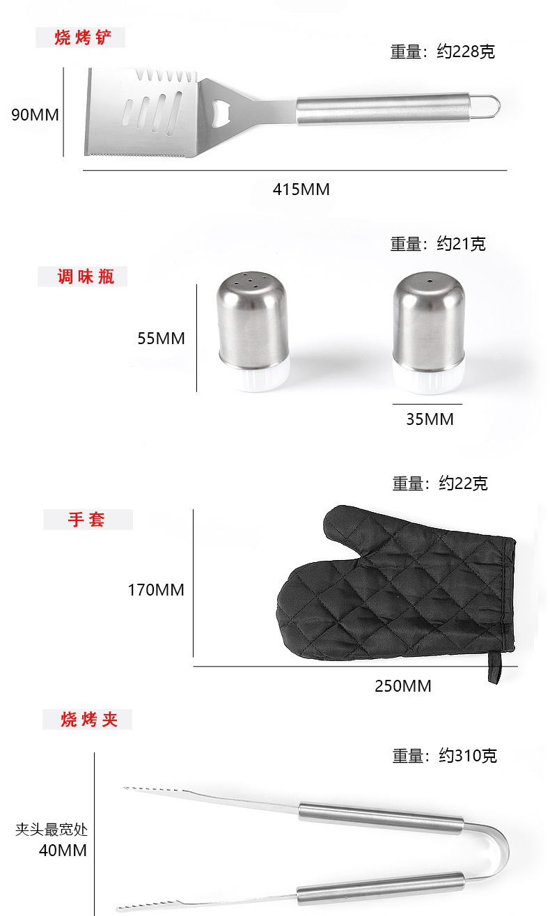 - 规格:6件大管柄烤具套装【围裙袋装】
