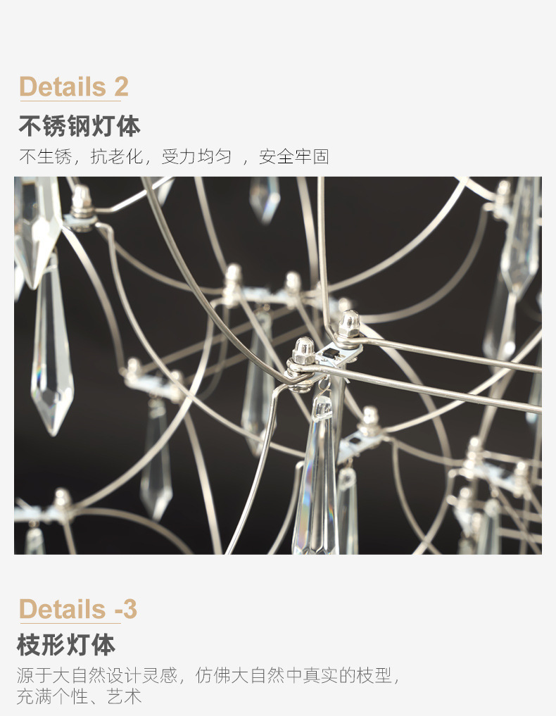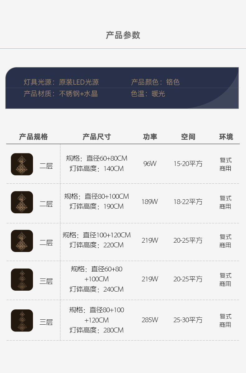 - 灯光颜色:铬色三层【60+80+100CM】暖光