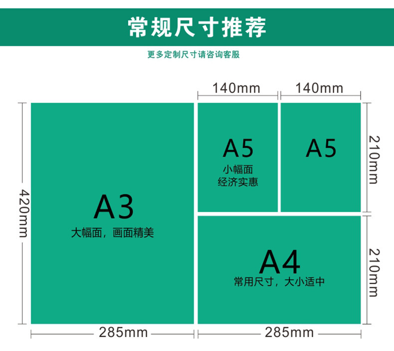 - 规格:A3:285*420mm,A4:210*285mm,A5:140*210mm