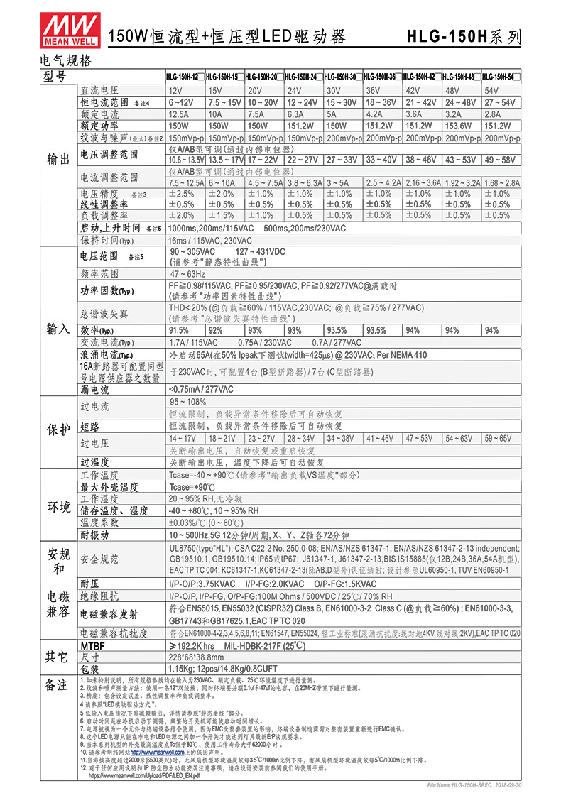HLG-150H台湾明纬12V防水电源恒流恒压LED驱动器IP67直流变压器